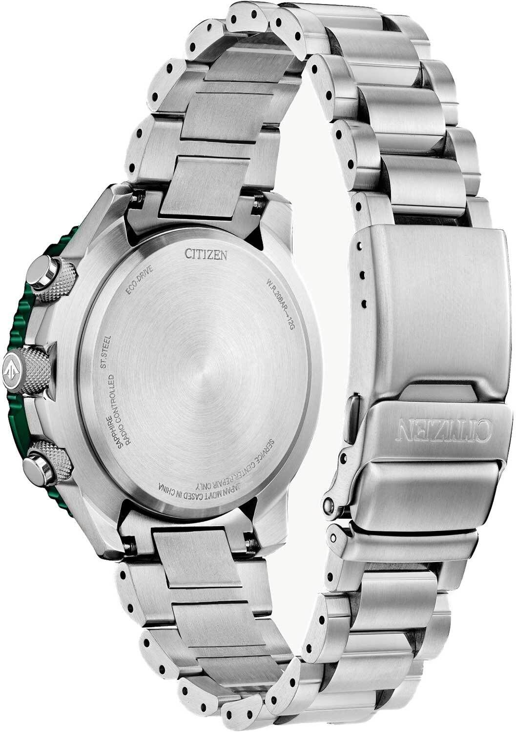 Мужские кварцевые аналоговые наручные часы-хронограф с секундомером. Серия Promaster Sky. Калибр механизма Citizen Е660. Часы оснащенный системой питания и подзарядки от солнечного света Eco-Drive не требующей замены батарейки. Система Eco-Drive - патентованная технология компании Citizen заключающаяся в размещении фотоэлементов под циферблатом и постоянно подзаряжающих аккумулятор часов при попадании солнечного света на циферблат. Запас хода после полной зарядки около 6 месяцев. Индикация недостаточного заряда элемента питания (EOL)- End of Life – в случае ослабевания заряда элемента питания, секундная стрелка двигается с интервалом в 2 секунды. Функции предотвращения перезарядки и сохранения энергии. Центральные часовая, минутная и секундная стрелки. Апертура даты в позиции 4 часов. Ретроградный стрелочный указатель дня недели. Вечный календарь. Мировое время - 24 города. Включение/выключение летнего времени. 12/24х часовой формат отображения времени. Секундомер с точностью 1с и временем измерения 1ч. Будильник. Автоматическая настройка времени и даты по радиосигналу. Зелёный циферблат с часовыми метками в виде штрихов. Стрелки и метки с люминесцентным покрытием, которое светится в темноте после непродолжительного воздействия света. Круглый стальной корпус с частичным зелёным покрытием на безеле. Диаметр корпуса 45,9 мм, толщина 13,7 мм. Переводная головка с защитой. Стальной браслет с раскладывающейся застежкой и с дополнительным фиксатором. Устойчивое к возникновению мелких царапин сапфировое стекло с антибликовым покрытием. Водостойкость WR 200 (любительский дайвинг). Вес около 190 г.