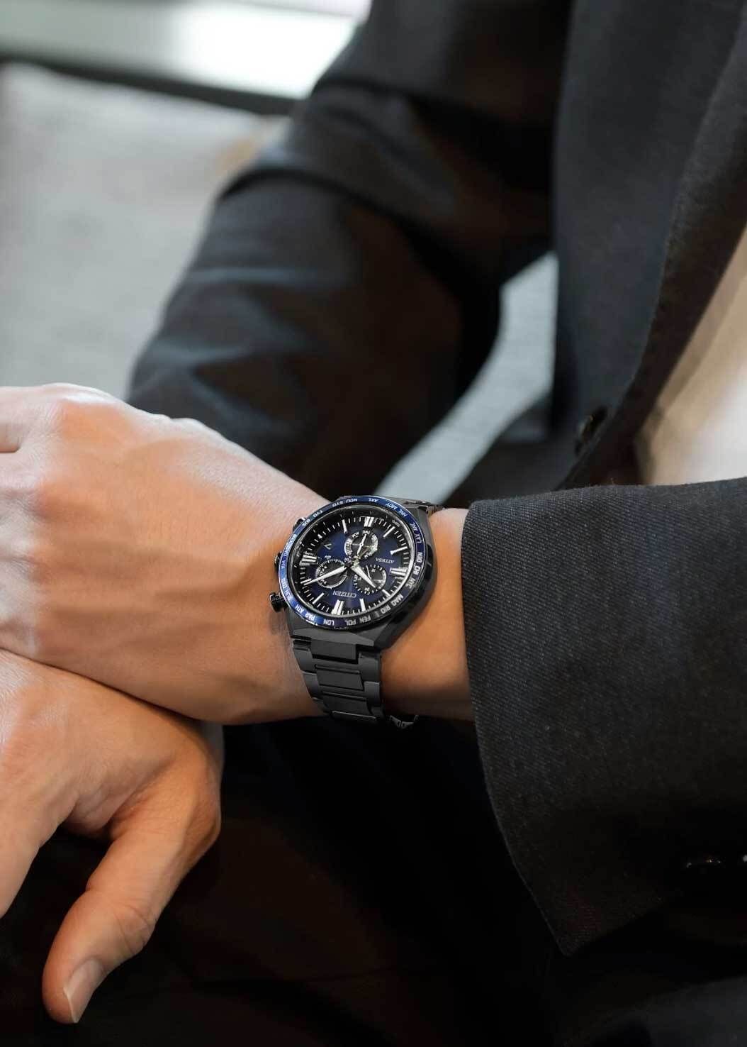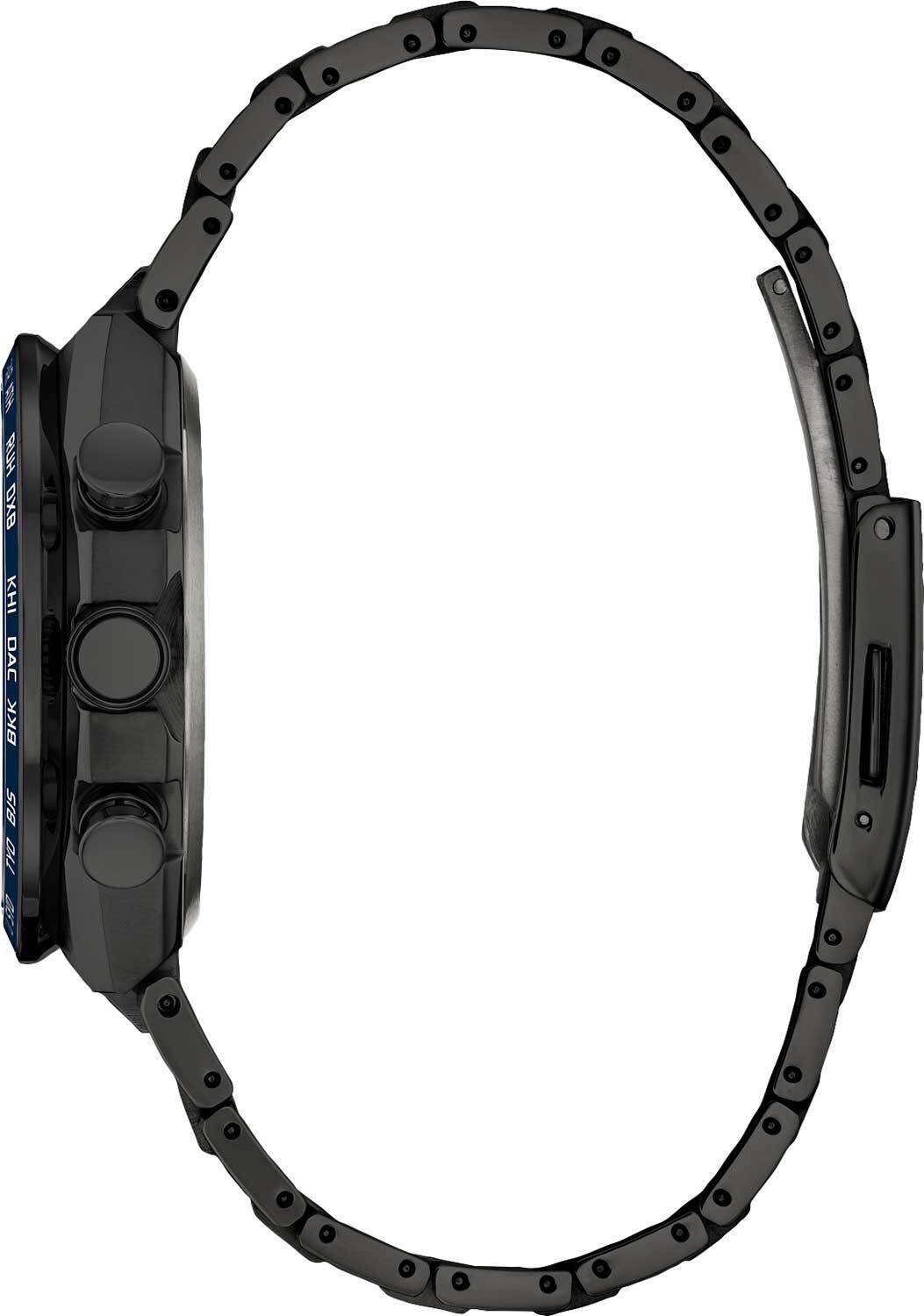 Мужские кварцевые аналоговые часы- хронограф с секундомером на солнечной батарее. Коллекция Eco-Drive Radio-Controlled Attesa. Калибр механизма E660. Часы оснащены системой питания и подзарядки от солнечного света Eco-Drive не требующей замены элемента питания. Система Eco-Drive - патентованная технология CIitizen заключающаяся в размещении фотоэлементов скрытых под циферблатом и постоянно заряжающих аккумулятор часов при попадании солнечного света на циферблат. Запас хода при полной зарядке аккумулятора до 180 дней. Режим сохранения заряда элемента питания. Функция индикации заряда (EOL - End of Life) – в случае ослабевания заряда элемента питания секундная стрелка перемещается с интервалом в 2 секунды. Функция предотвращения перезарядки. Указатель запаса хода. Автоматическая настройка времени по радиосигналу (Германия, Япония, США, Китай). Центральные часовая, минутная и секундная стрелки. Синий циферблат с часовыми метками в виде штрихов. Стрелки и часовые метки с люминесцентным покрытием, которое светится в темноте после непродолжительного воздействия света. Индикация даты в позиции 4 ч. Ретроградный стрелочный указатель дня недели вынесен на дополнительный малый циферблат в позиции 2 ч. Стрелочный указатель времени суток на дополнительном малом циферблате в положении 10 часов. Мировое время (24 часовых пояса). Второй часовой пояс. Секундомер с точностью 1с и временем измерения 1ч. Вечный календарь (до 28 февраля 2100 года). Будильник. Включение/отключение летнего времени. Круглый корпус из титана с Duratect (Super Titanium™) DLC покрытием чёрного цвета. Диаметр корпуса 42 мм, толщина 12,5 мм. Устойчивое к возникновению мелких царапин сапфировое стекло с антибликовым покрытием. Титановый браслет с Duratect (Super Titanium™) DLC покрытием чёрного цвета, раскладывающаяся застежка. Водонепроницаемость 200WR (часы подходят для плавания с маской и трубкой, обычного плавания).