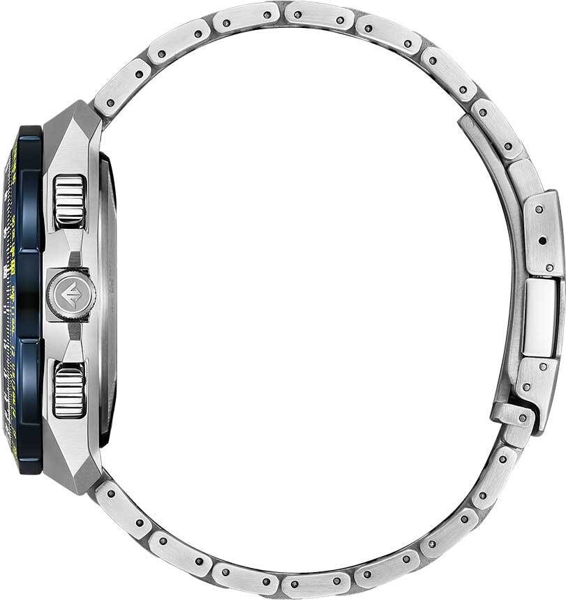 Мужские кварцевые аналогово-цифровые часы- хронограф с секундомером на солнечной батарее. Коллекция Promaster Blue Angels Skyhawk A-T. Модель посвящена пилотам эскадрильи ВМФ США «Голубые ангелы». Калибр механизма U680. Часы оснащенный системой питания и подзарядки от солнечного света Eco-Drive не требующей замены элемента питания. Система Eco-Drive - патентованная технология Citizen заключающаяся в размещении фотоэлементов скрытых под циферблатом и постоянно заряжающих аккумулятор часов при попадании солнечного света на циферблат часов. Функция индикации заряда (EOL - End of Life) – в случае ослабевания элемента питания секундная стрелка перемещается через 2 деления. Функции энергосбережения и предотвращения перезаряда. Время работы при полностью зараженной батарее до 180 дней. Синхронизация времени по радиосигналу (Германия, Япония, США, Китай). Индикатор приема сигнала, индикатор уровня приема сигнала калибровки, подтверждение статуса приема сигнала. Центральные часовая, минутная и секундная стрелки. Синий циферблат с часовыми метками в виде штрихов и двух арабских цифр 3 и 9. Стрелки и часовые метки с люминесцентным покрытием, которое светится в темноте после непродолжительного воздействия света. Светодиодная подсветка циферблата. Секундомер с точностью показаний 1/100c и временем измерения 24ч. Таймер обратного отсчета от 1 минуты до 99 минут. Второй часовой пояс. 12-ти и 24-х часовой формат отображения времени. Мировое время (43 города). Вечный календарь. Всемирное координированное время (UTC). Включение/выключение летнего времени. 2 будильника. Вращающийся безель с логарифмической линейкой для пилота. Рифленая переводная головка с защитой. Круглый стальной корпус диаметром корпуса 45,7 мм, толщиной 14,3 мм. Устойчивое к возникновению мелких царапин сапфировое стекло с антибликовым покрытием. Стальной браслет с раскладывающейся застежкой. Задняя крышка украшена эмблемой Blue Angels. Водонепроницаемость 200WR (часы подходят для плавания с маской, трубкой, обычного плавания). Вес около 186 г.