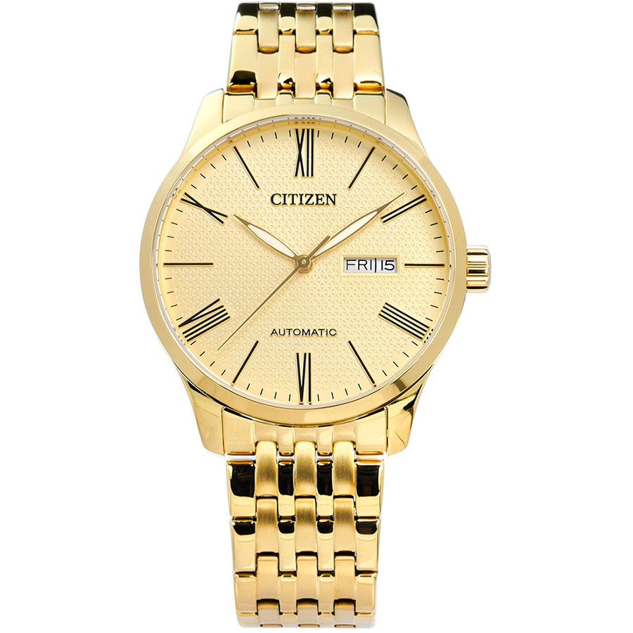 Мужские аналоговые механические часы с автоподзаводом. Коллекция Automatic. Калибр механизма Citizen 8200 на 21 камне. Частота 21600 колебаний в час, запас хода около 42 часов. Основное достоинство часов с автоподзаводом состоит в том, что их не надо ежедневно заводить, т. к. в таких часах пружина заводного барабана получает энергию от вращающегося эксцентрика (ротора), который приходит в движение при любом изменении положения механизма. Если носить такие часы каждый день, подводить их вручную не нужно. Центральные часовая, минутная и секундная стрелки. Апертура даты и дня недели в позиции 3 часов. Золотистый циферблат с часовыми метками в виде штрихов и римских цифр. Стрелки с люминесцентным покрытием, которое светится в темноте после непродолжительного воздействия света. Круглый корпус из нержавеющей стали с IP покрытием цвета жёлтого цвета. Диаметр корпуса 40 мм, толщина 11 мм. Стальной браслет с IP покрытием цвета жёлтого золота, раскладывающаяся застежка. Устойчивое к мелким механическим повреждениям минеральное стекло. Завинчивающаяся задняя крышка. Водонепроницаемость 50WR (мытье рук, дождь). Вес около 129 г.