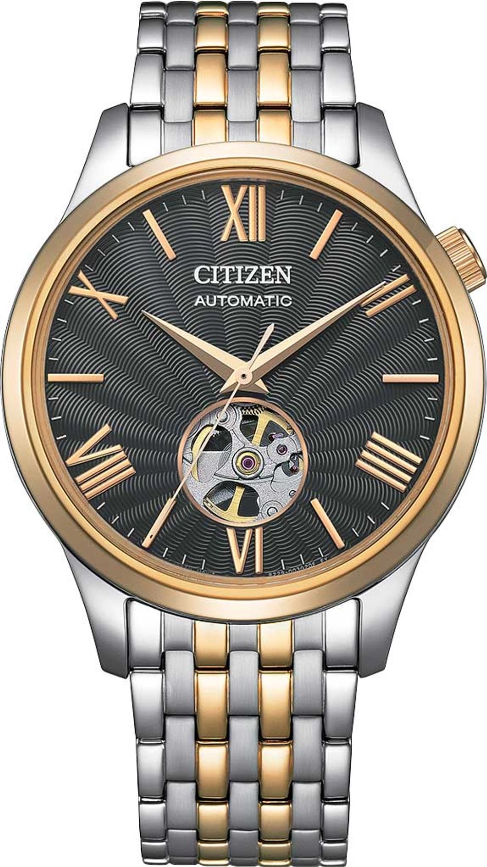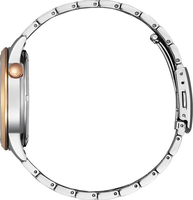 Мужские аналоговые механические часы с автоподзаводом. Коллекция Automatic. Основное достоинство часов с автоподзаводом состоит в том, что их не надо ежедневно заводить, т. к. в таких часах пружина заводного барабана получает энергию от вращающегося эксцентрика (ротора), который приходит в движение при любом изменении положения механизма. Если носить такие часы каждый день, подводить их вручную не нужно. Калибр механизма 8229. В механизме 21 рубиновый камень, частота 21600 полуколебаний в час. Запас хода не менее 40-ка часов. Центральные часовая, минутная и секундная стрелки золотистого цвета. Чёрный циферблат с открытым балансом хода. Часовые метки в виде золотистых штрихов и римских цифр. Круглый корпус из нержавеющей стали с IP покрытием цвета розового золота на безеле. Диаметр корпуса 40 мм, толщина 10,7 мм. Устойчивое к возникновению царапин сапфировое стекло. Рифлёная переводная головка в позиции 2 ч. Стальной браслет с частичным IP покрытием цвета розового золота, раскладывающаяся застежка. Прозрачная задняя крышка. Водонепроницаемость WR 50 (мытье рук, дождь). Вес около 130 г.