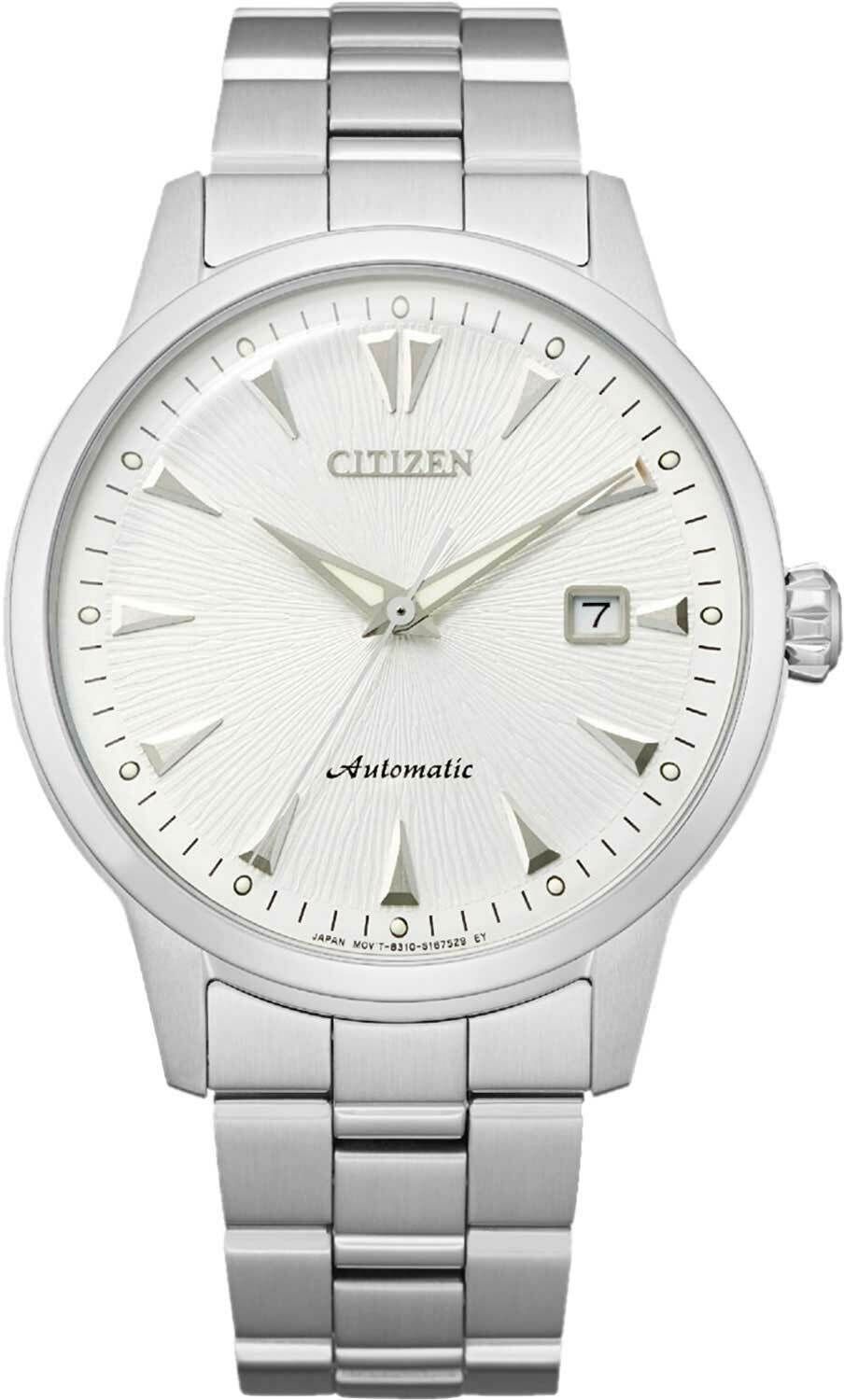Мужские механические часы с автоподзаводом. Калибр механизма Citizen 8310 на 21 камне. Частота 21 600 полуколебаний в час. Запас хода 60 часов. Центральные часовая, минутная и секундная стрелки. Апертура даты в позиции 3 часов. Серебристый циферблат. Круглый корпус выполнен из нержавеющей стали. Диаметр корпуса составляет 41 мм, толщина 12,6 мм. Стальной браслет, раскладывающаяся застежка. Прозрачная задняя крышка. Прочное минеральное стекло устойчивое к мелким механическим повреждениям. Водостойкость WR 50 (мытье рук, дождь). Вес примерно 127 г.