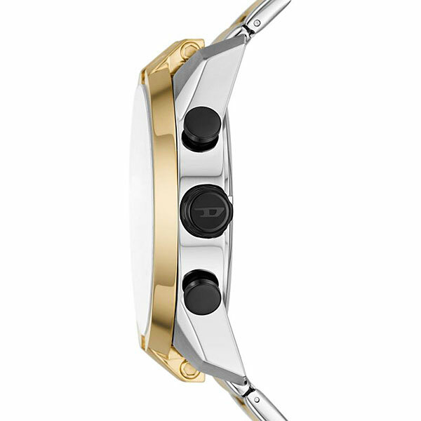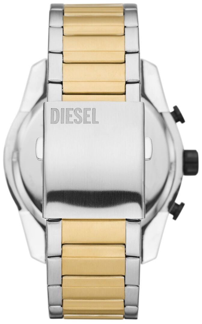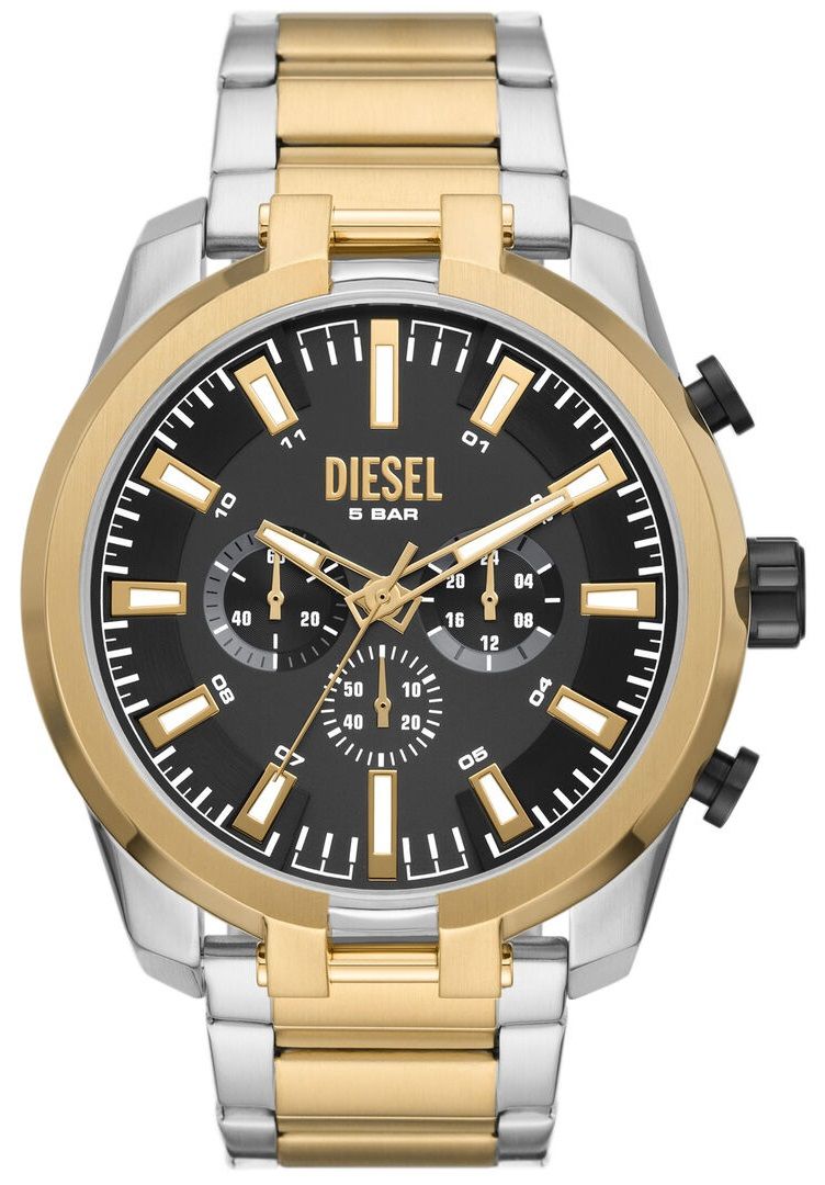 Мужские аналоговые кварцевые часы-хронограф с секундомером. Коллекция Split. Центральные часовая, минутная и секундная стрелки. Чёрный циферблат с часовыми метками в виде штрихов. Стрелки и метки с люминесцентным покрытием, которое светится в темноте после непродолжительного нахождения на свету. 12-ти и 24-х часовой формат отображения времени вынесен на малый циферблат в позиции 3 ч. Круглый корпус из нержавеющей стали с частичным покрытием цвета жёлтого золота на безеле. Диаметр корпуса 51 мм, толщина 12,9 мм. Минеральное стекло устойчивое к мелким механическим повреждениям. Стальной браслет с частичным покрытием цвета жёлтого золота, раскладывающаяся застежка. Ширина браслета 26 мм. Водостойкость WR 50 (мытьё рук, дождь).