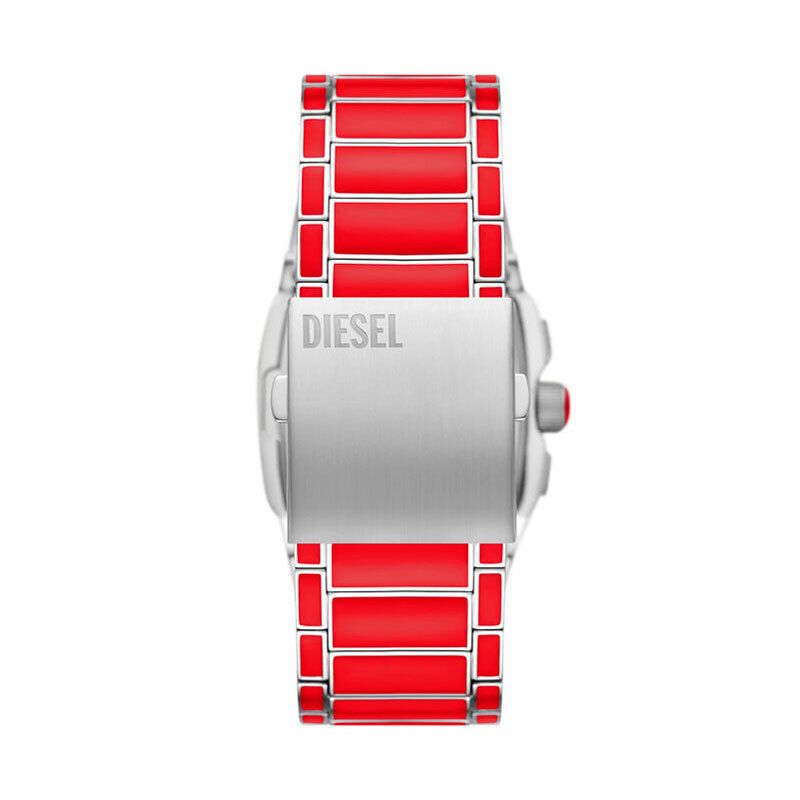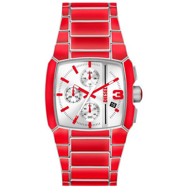 Мужские кварцевые аналоговые наручные часы-хронограф с секундомером. Коллекция Cliffhanger. Центральные часовая, минутная и секундная стрелки. Серебристый циферблат с часовыми метками в виде штрихов. Стрелки с люминесцентным покрытием, которое светится в темноте после непродолжительного воздействия света. Окошко даты в положении между 3 и 4 ч. 12-ти и 24-х часовой формат отображения времени на отдельном малом циферблате в положении 12 ч. Секундомер. Квадратный стальной корпус с покрытием красной эмали. Рифленая переводная головка с защитой. Устойчивое к мелким механическим повреждениям минеральное стекло. Стальной браслет с покрытием красной эмали, раскладывающаяся застежка. Водозащита 50WR (мытье рук, дождь).