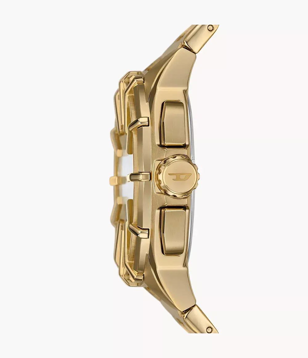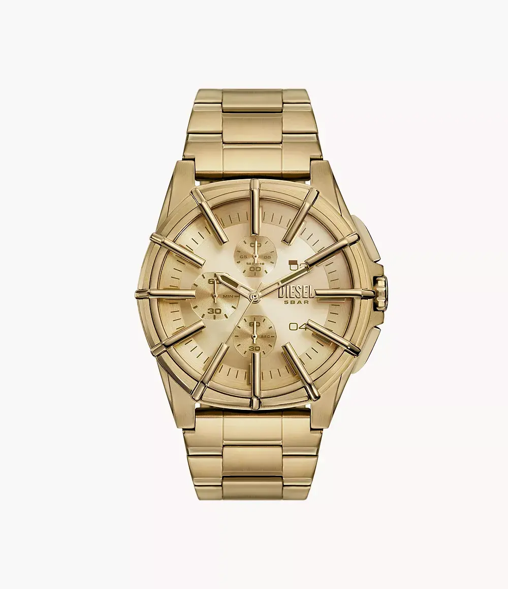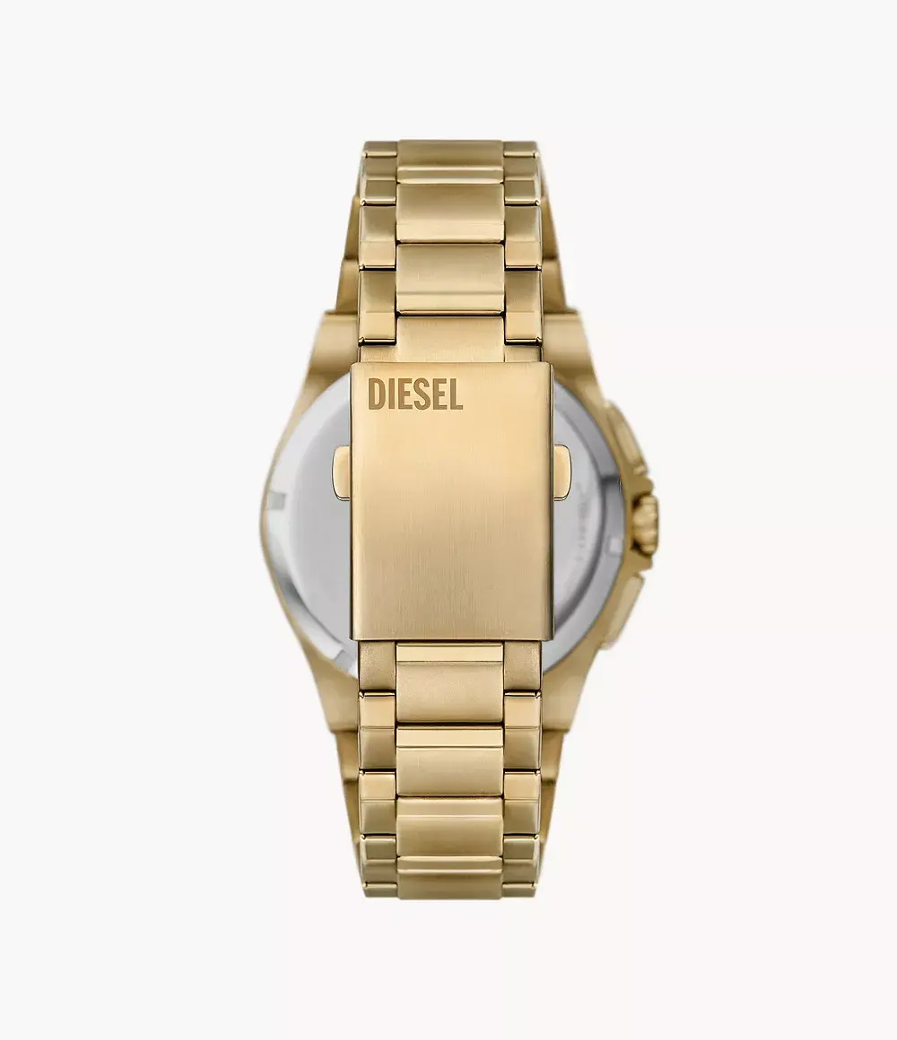 Мужские кварцевые аналоговые наручные часы-хронограф с секундомером. Коллекция Framed. Центральные часовая, минутная и секундная стрелки. Золотистый циферблат с часовыми метками в виде штрихов. Круглый стальной корпус с покрытием цвета жёлтого золота. Диаметр корпуса 44 мм, толщин 13 мм. Рифленая переводная головка с защитой. Устойчивое к мелким механическим повреждениям минеральное стекло. Стальной браслет с покрытием цвета жёлтого золота, раскладывающаяся застежка. Водозащита 50WR (мытьё рук, дождь).