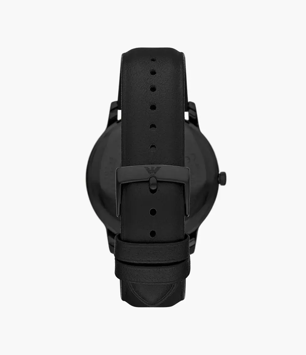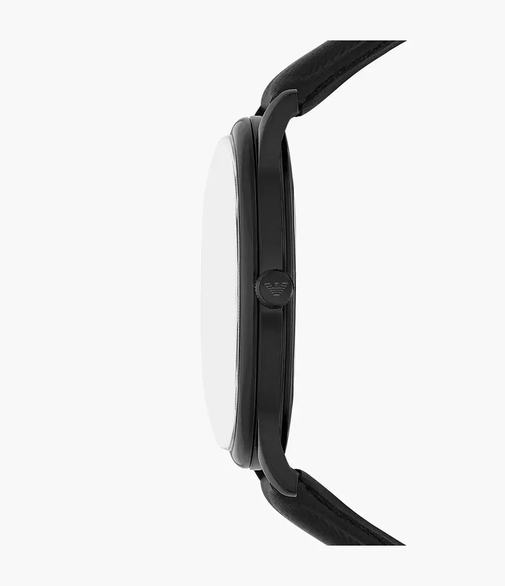 Мужские кварцевые аналоговые наручные часы. Коллеция N/A. Центральные часовая, минутная и секундная стрелки. Чёрный циферблат с часовыми метками в виде штрихов и римских цифр. Окошко даты в положении 3 ч. Круглый стальной корпус с покрытием чёрного цвета. Диаметр корпуса 42 мм. Рифленая переводная головка. Устойчивое к мелким механическим повреждениям минеральное стекло. Чёрный кожаный ремешок с классической застёжкой buckle. Водозащита 50WR (мытьё рук, дождь).