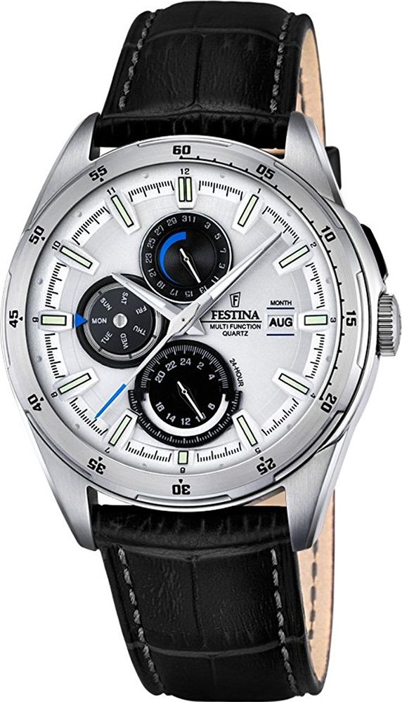 Мужские кварцевые аналоговые наручные часы. Коллекция Festina Multifuntcion. 12/24 часовой формат времени. Индикатор числа, дня недели и месяца. Люминесцентные стрелки. Круглый корпус из нержавеющей стали. Кожаный ремешок.