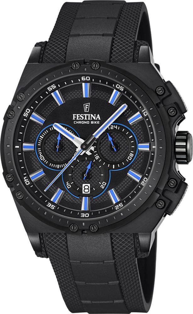 Мужские спортивные аналоговые кварцевые наручные часы с хронографом. Коллекцмя Festina Chrono Bike. Круглый стальной корпус. 12/24 часовой формат времени. Каучуковый ремешок.