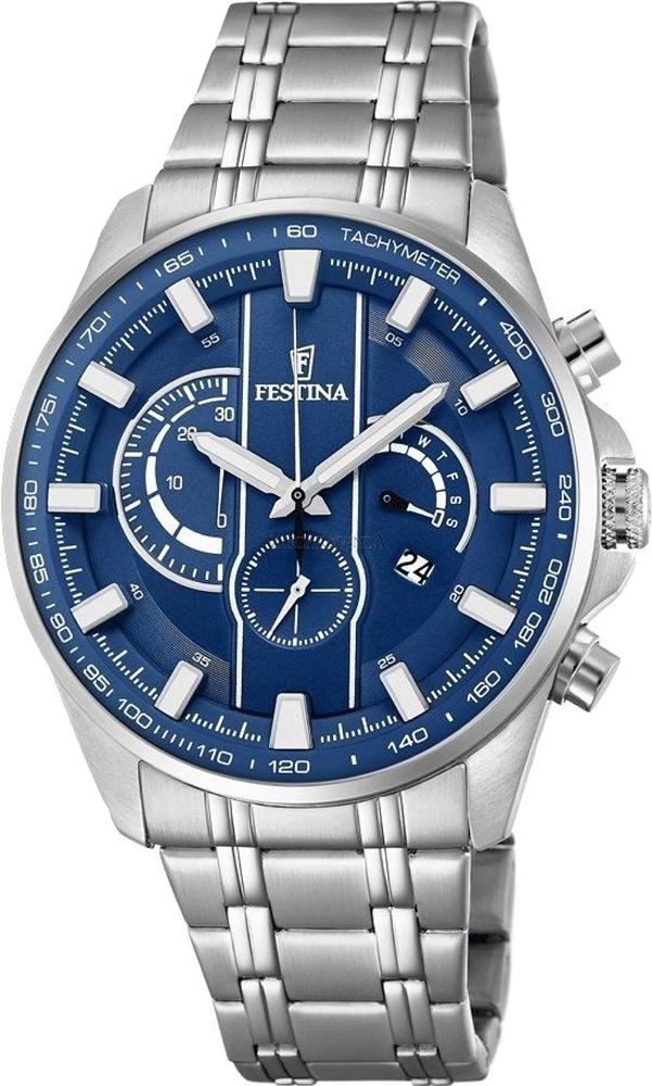 Мужские кварцевые аналоговые наручные часы-хронограф с секундомером. Круглый стальной корпус. Тахиметрическая шкала. Стальной браслет.