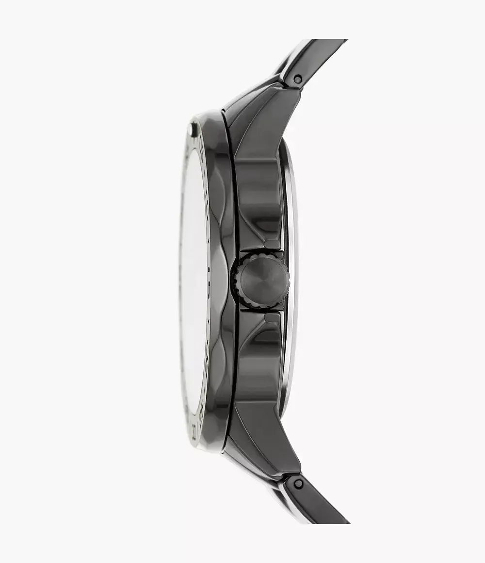Мужские кварцевые аналоговые наручные часы. Коллекция Bannon. Центральные часовая, минутная и секундная стрелки. Чёрный циферблат с часовыми метками в виде штрихов. Стрелки и метки с люминесцентным покрытием, которое светится в темноте после непродолжительного воздействия света. Окошко даты в позиции 3 ч. Круглый корпус из нержавеющей стали с покрытием чёрного цвета. Диаметр корпуса 45 мм. Устойчивое к мелким механическим повреждениям минеральное стекло. Рифленая переводная головка с защитой. Минутная шкала на безеле. Стальной браслет с покрытием чёрного цвета, раскладывающаяся застёжка с 2 кнопками. В коплект входит дополнительный сменный чёрный пластиковый ремешок с классической застёжкой buckle. Водозащита 50WR (мытьё рук, дождь).