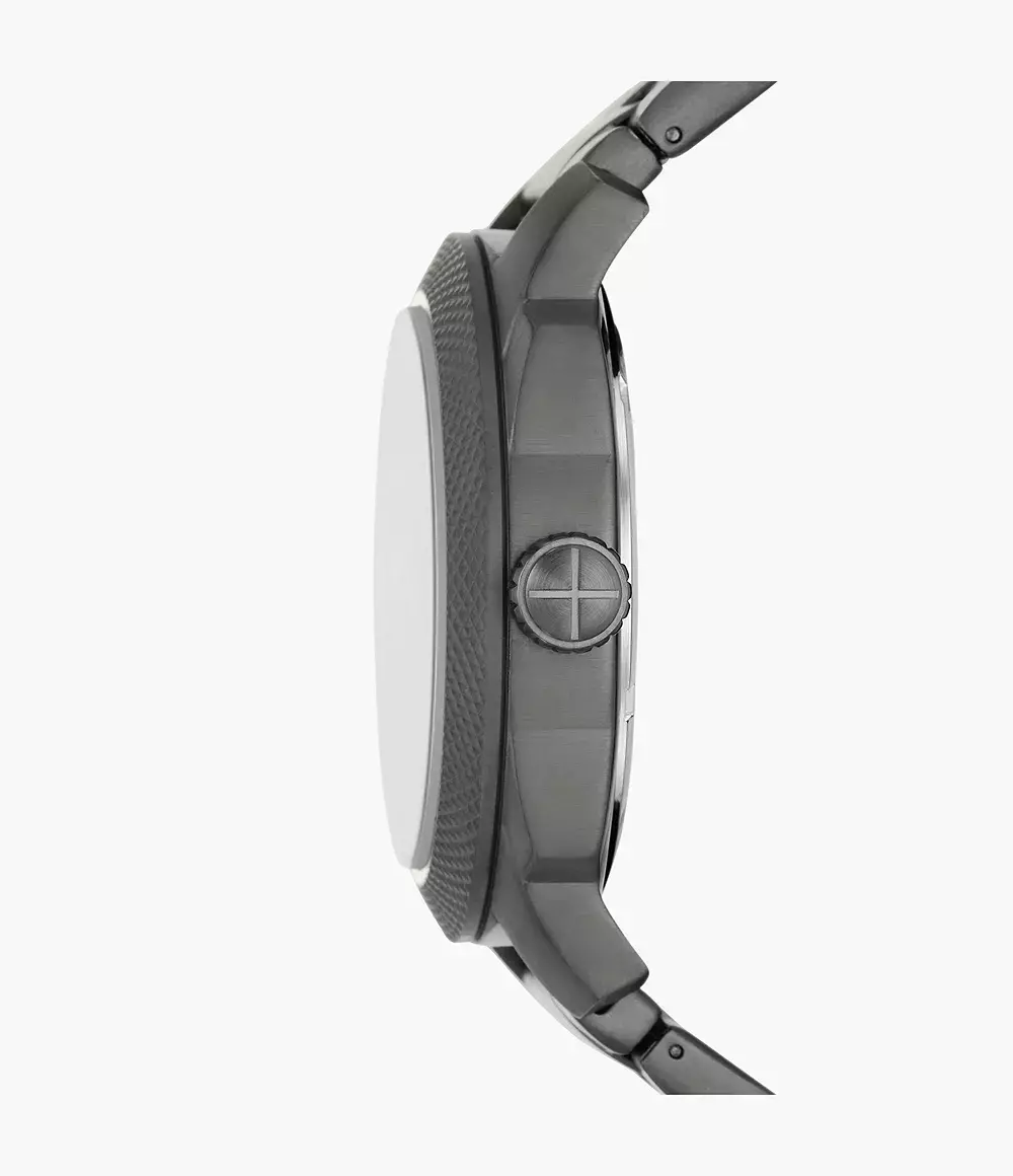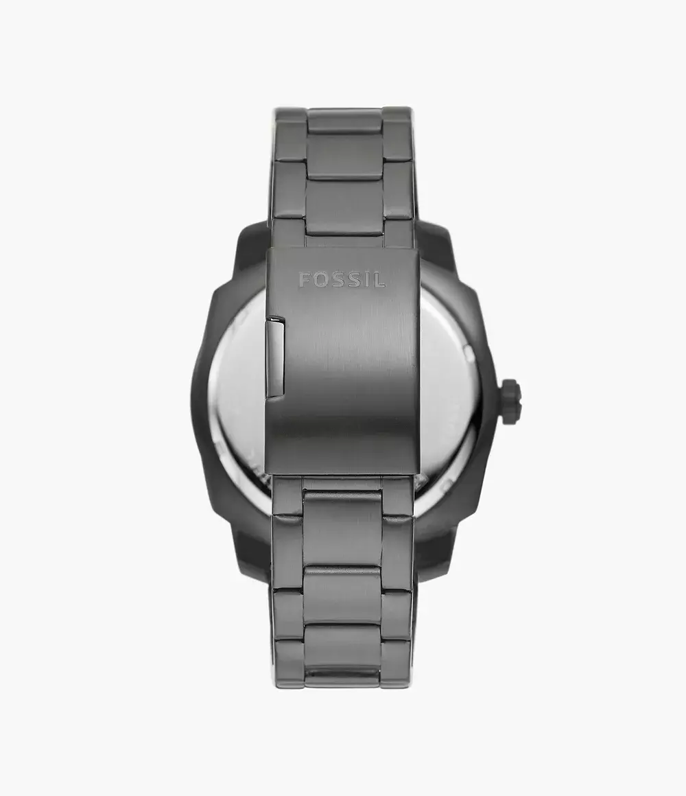 Мужские аналоговые кварцевые часы. Коллекция Machine. Центральные часовая, минутная и секундная стрелки. Чёрный циферблат с часовыми метками в виде штрихов. Стрелки и метки с люминесцентным покрытием, которое светится в темноте после непродолжительного нахождения на свету. Окошко даты в положении 6 ч. Круглый корпус из нержавеющей стали с покрытием серого цвета. Диаметр корпуса 49 мм, толщина 12 мм. Устойчивое к мелким механическим повреждениям минеральное стекло. Стальной браслет с покрытием серого цвета с раскладывающейся застёжкой. Ширина браслета 24 мм. Водонепроницаемость 100 WR (плавание и ныряние без акваланга).