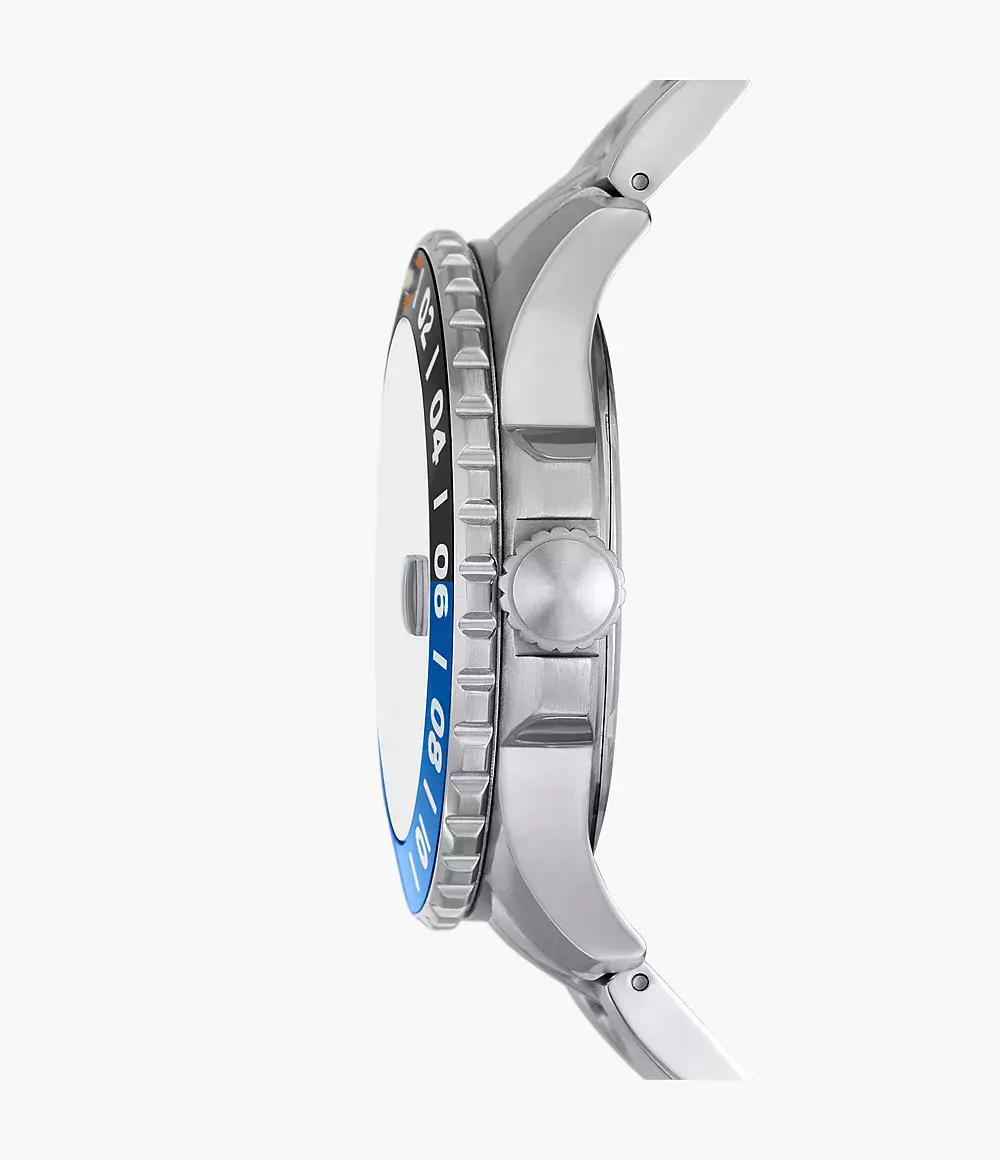 Мужские кварцевые аналоговые наручные часы. Коллекция Fossil Blue GMT. Центральные часовая, минутная и секундная стрелки. На стрелки нанесено люминесцентное покрытие (светятся в темноте после нахождения на свету). Индикация даты в положении 3 ч. GMT-стрелка (Greenwich Mean Time – среднее время по Гринвичу) — функция одновременного отображения времени в двух часовых поясах. Круглый корпус из нержавеющей стали. Вращающаяся 24-часовая шкала Циферблат синего цвета. Диаметр корпуса 46 мм. Устойчивое к мелким механическим повреждениям минеральное стекло. Браслет из нержавеющей стали с раскладывающейся застежкой с одной кнопкой.. Водостойкость WR 100 (плавание и ныряние без акваланга).