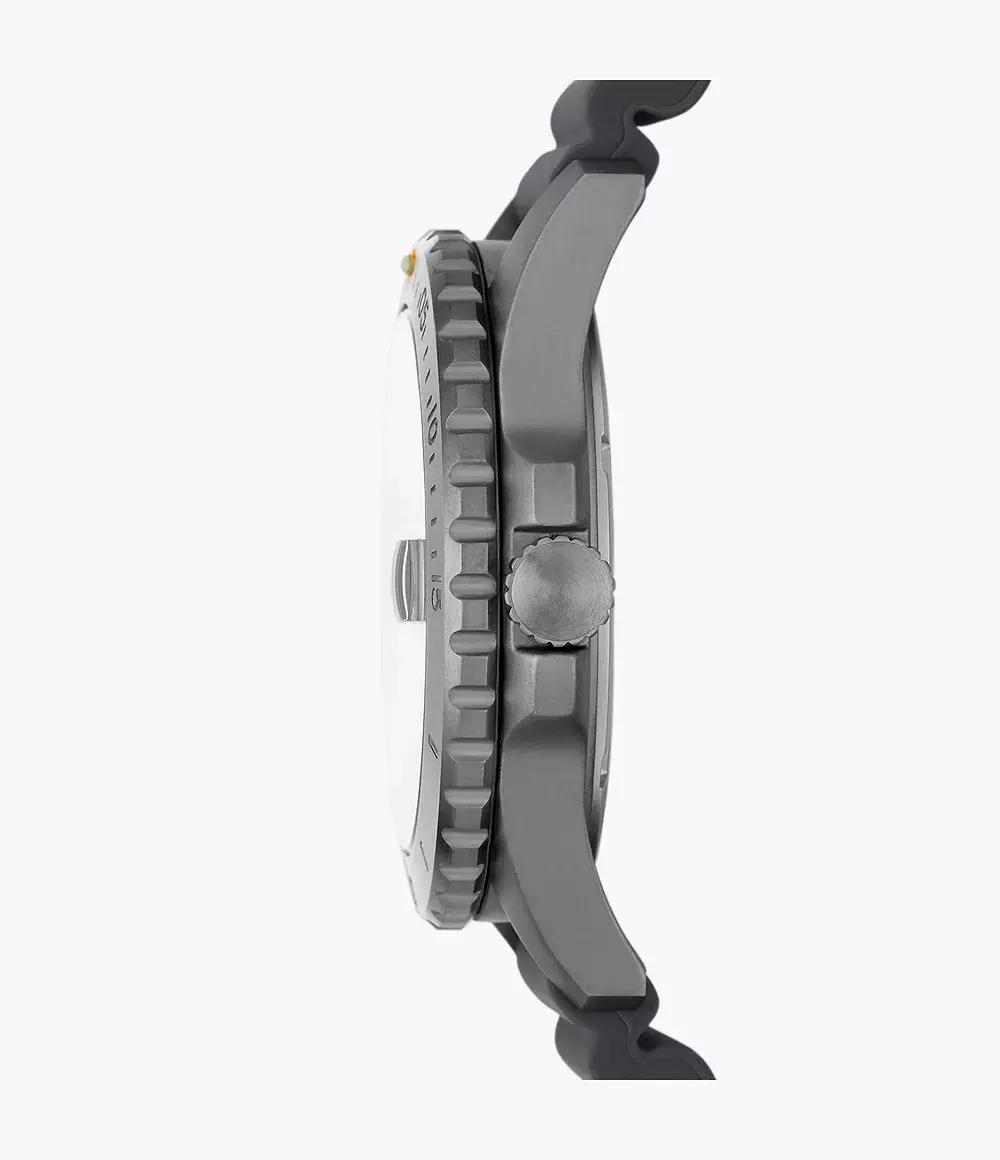 Мужские кварцевые аналоговые наручные часы. Коллекция Fossil Blue Dive. Центральные часовая, минутная и секундная стрелки. На стрелки нанесено люминесцентное покрытие (светятся в темноте после нахождения на свету). Индикация даты в положении 3 ч. Круглый корпус из нержавеющей стали с PVD-покрытием серого цвета. Циферблат серого цвета. Диаметр корпуса 42 мм. Устойчивое к мелким механическим повреждениям минеральное стекло. Пластиковый ремешок серого цвета со стандартной застёжкой. Водостойкость WR 100 (плавание и ныряние без акваланга).