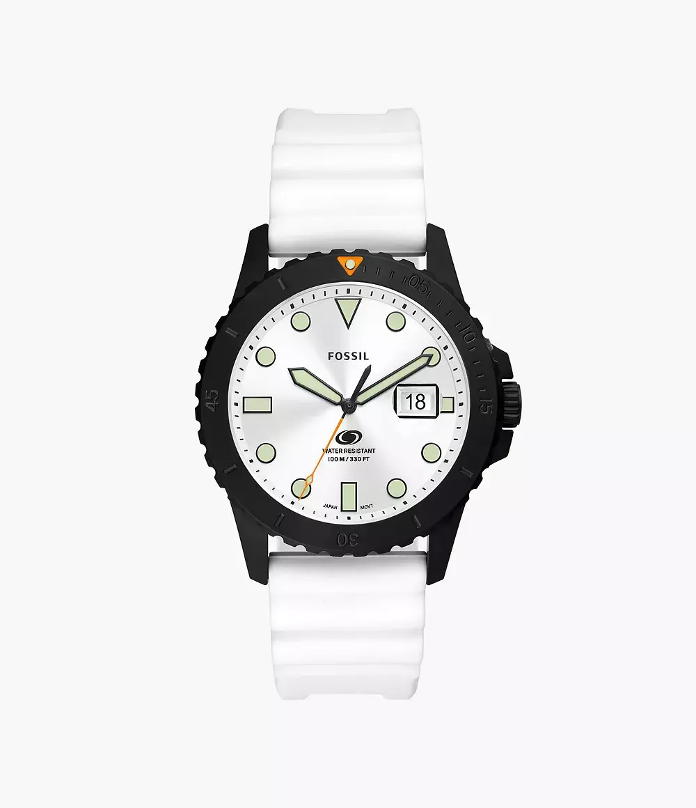 Мужские кварцевые аналоговые наручные часы. Коллекция Fossil Blue Dive. Центральные часовая, минутная и секундная стрелки. На стрелки нанесено люминесцентное покрытие (светятся в темноте после нахождения на свету). Индикация даты в положении 3 ч. Круглый корпус из нержавеющей стали с PVD-покрытием чёрного цвета. Циферблат белого цвета. Диаметр корпуса 42 мм. Устойчивое к мелким механическим повреждениям минеральное стекло. Пластиковый ремешок белого цвета со стандартной застёжкой. Водостойкость WR 100 (плавание и ныряние без акваланга).