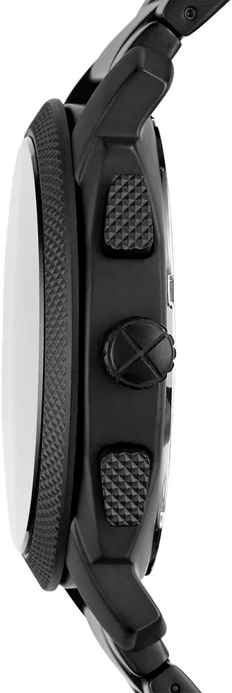 Мужские кварцевые аналоговые наручные часы-хронограф с секундомером. Центральные часовая, минутная и секундная стрелки. Чёрный циферблат с часовыми метками в виде штрихов. Стрелки с люминесцентным покрытием, которое светится в темноте после непродолжительного воздействия света. Окошко даты между метками 4 и 5 часов. Дополнительно на малом циферблате в положении 3 ч отображается текущее время в 24-х часовом формате. Секундомер. Круглый корпус из нержавеющей стали с покрытием чёрного цвета. Диаметр корпуса 42 мм. Рифленая переводная головка Устойчивое к мелким механическим повреждениям минеральное стекло. Стальной браслет с покрытием чёрного цвета, раскладывающаяся застежка. Водозащита 50WR (мытьё рук, дождь).