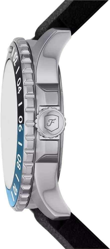 Мужские кварцевые аналоговые наручные часы. Коллекция Blue GMT. Центральные часовая, минутная и секундная стрелки. Синий циферблат с часовыми метками в виде штрихов и точек. Стрелки и метки с люминесцентным покрытием, которое светится в темноте после непродолжительного воздействия света. Окошко даты с увеличительным стеклом в положении 3 ч. Рифленый безель. Второй часовой пояс в 24-х часовом формате времени отображается центральной стрелкой. Круглый стальной корпус диаметром 46 мм. Рифленая переводная головка с защитой. Устойчивое к мелким механическим повреждениям минеральное стекло. Чёрный пластиковый ремешок с классической застёжкой buckle. Водозащита 100WR (плавание с маской и трубкой).