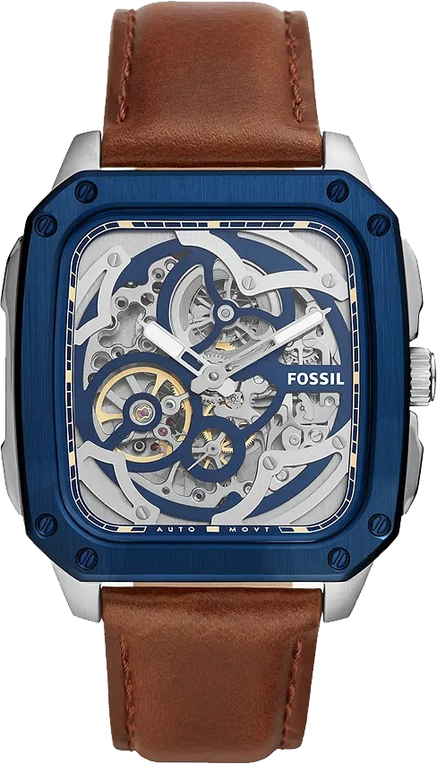 Мужские аналоговые механические наручные часы с автоподзаводом. Коллекция Inscription Центральные часовая и минутная стрелки. Секундная стрелка вынесена на отдельный малый циферблат в положении 6 ч. Стрелки с люминесцентным покрытием, которое светится в темноте после непродолжительной зарядки на свету. В механизме 20 камней. Данные часы необходимо носить для обеспечения их правильного хода, так как механизм заводится при движении руки (вращаясь, полукруглый ротор приводит в движение заводную пружину). Прямоугольный корпус-скелетон из нержавеющей стали. Размер корпуса 42 мм х 42 мм. Устойчивое к мелким механическим повреждениям минеральное стекло. Кожаный коричневый ремешок шириной 22 мм. Водозащищённость 50WR (мытьё рук, дождь).