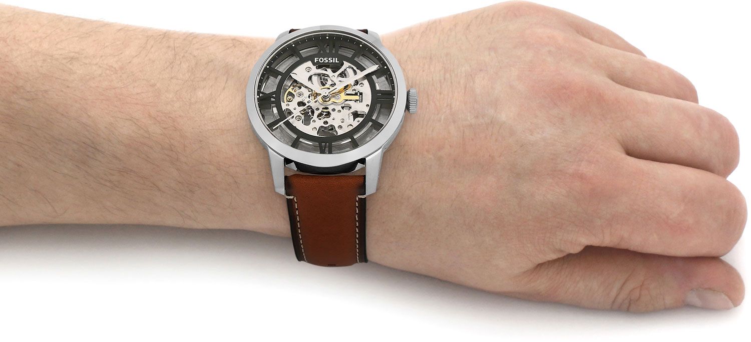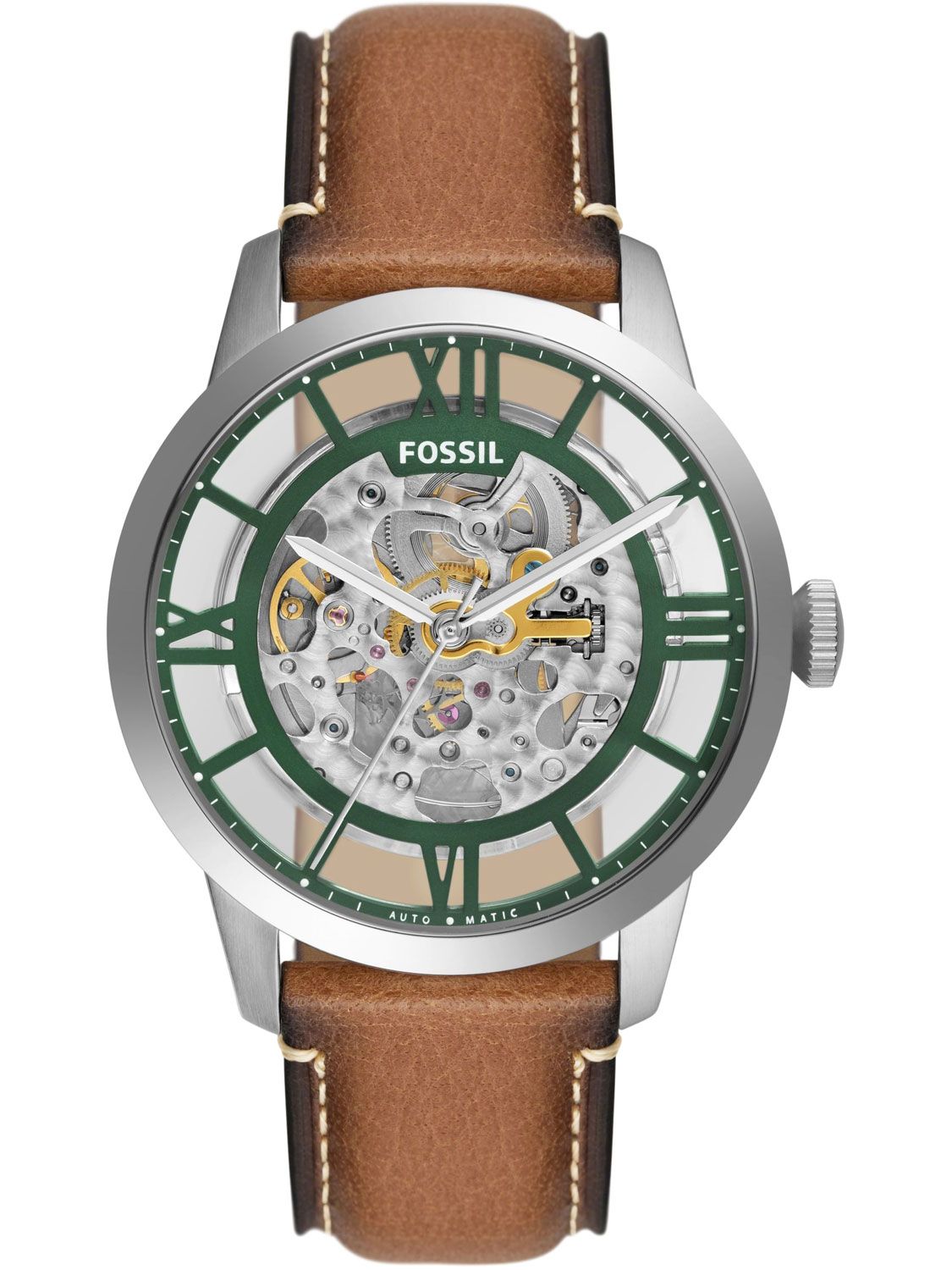 Мужские механические аналоговые часы-скелетон. Skeleton (с греч. «скелет, каркас») — механические (реже кварцевые) часы, в которых движущиеся части механизма полностью или частично оставлены открытыми, просматривающимися через специальное окошко в циферблате или задней крышке. Основное достоинство часов с автоподзаводом состоит в том, что их не надо ежедневно заводить, т. к. в таких часах пружина заводного барабана получает энергию от вращающегося эксцентрика (ротора), который приходит в движение при любом изменении положения механизма. Если носить такие часы каждый день, подводить их вручную не нужно. Коллекция Townsman Automatic. Центральные часовая, минутная и секундная стрелки. Прозрачный циферблат с часовыми метками в виде штрихов и четырёх римских цифр зелёного цвета. Через окошко в циферблате виден механизм часов. Круглый корпус из нержавеющей стали. Диаметр корпуса 44 мм. Устойчивое к мелким механическим повреждениям минеральное стекло. Прозрачная задняя крышка. Коричневый кожаный ремешок с классической застёжкой buckle. Ширина ремешка 22мм. Водонепроницаемость 50 WR (мытьё рук).