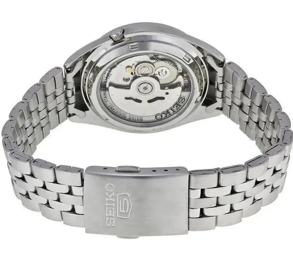 Мужские аналоговые наручные часы механические с автоподзаводом. Коллекции Automatic Seiko 5. Калибр механизма 7S26 (21 камень в механизме, 21 600 полуколебаний в час). Запас хода около 40-ка часов. Центральные часовая, минутная и секундная стрелки. Серебристый циферблат с часовыми метками в виде штрихов. Стрелки с люминесцентным напылением LumiBright, которое светится в темноте после непродолжительного воздействия света. Апертура даты и дня недели в позиции 3 ч. Стекло Хардлекс (Hardlex) - закаленное минеральное стекло, разработанное компанией Seiko Watch Corporation, которое обладает высокой устойчивостью к мелким механическим повреждениям и царапинам. Круглый корпус из нержавеющей стали. Диаметр корпуса 38 мм, толщина 11 мм. Переводная головка в позиции 4 ч. Прозрачная завинчивающаяся задняя крышка. Стальной браслет с раскладывающейся застежкой. Водонепроницаемость WR30 (брызги).