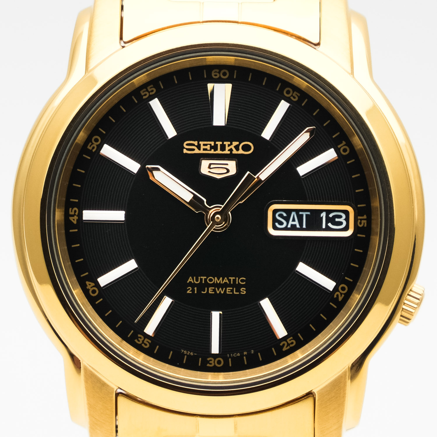 Мужские аналоговые наручные часы механические с автоподзаводом. Коллекции Automatic Seiko 5. Калибр механизма 7S26 (21 камень в механизме, 21 600 полуколебаний в час). Запас хода около 40-ка часов. Центральные часовая, минутная и секундная стрелки. Чёрный циферблат с часовыми метками в виде штрихов. Стрелки и часовые метки с люминесцентным напылением LumiBright, которое светится в темноте после непродолжительного воздействия света. Апертура даты и дня недели в позиции 3 ч. Стекло Хардлекс (Hardlex) - закаленное минеральное стекло, разработанное компанией Seiko Watch Corporation, которое обладает высокой устойчивостью к мелким механическим повреждениям и царапинам. Круглый корпус из нержавеющей стали с покрытием цвета розового золота. Диаметр корпуса 38 мм, толщина 11 мм. Переводная головка в позиции 4 ч. Прозрачная завинчивающаяся задняя крышка. Стальной браслет с покрытием цвета розового золота, раскладывающаяся застежка. Водонепроницаемость WR30 (брызги).