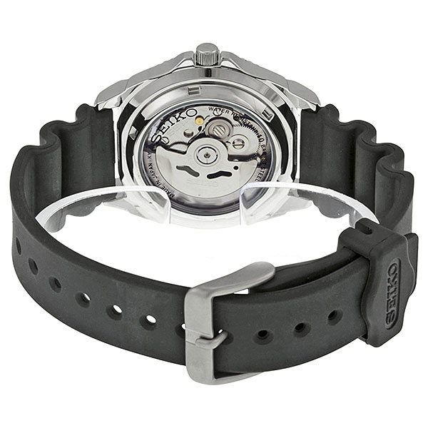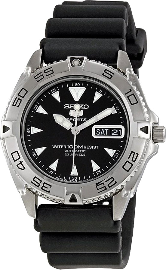 Мужские механические наручные часы с автоподзаводом. Коллекция Seiko 5 Sports. Калибр механизма 7S36 (23 камня в механизме, 21 600 полуколебаний в час). Запас хода около 40-ка часов. Центральные часовая, минутная и секундная стрелки. Чёрный циферблат с часовыми метками в виде штрихов. Стрелки и часовые метки с люминесцентным напылением LumiBright, которое светится в темноте после непродолжительного воздействия света. Индикация даты и дня недели в позиции 3 часов Стекло Хардлекс (Hardlex) - закаленное минеральное стекло, разработанное компанией Seiko Watch Corporation, обладающее высокой устойчивостью к мелким механическим повреждениям и царапинам. Круглый корпус из нержавеющей стали. Диаметр корпуса 41 мм, толщина 12 мм. Однонаправленный поворотный безель с минутной шкалой. Переводная головка в позиции 3 часов. Чёрный пластиковый ремешок с классической застежкой buckle. Прозрачная завинчивающаяся задняя крышка. Водонепроницаемость WR100 (часы подходят для плавания с маской, трубкой и обычного плавания). Японская сборка (Made In Japan).