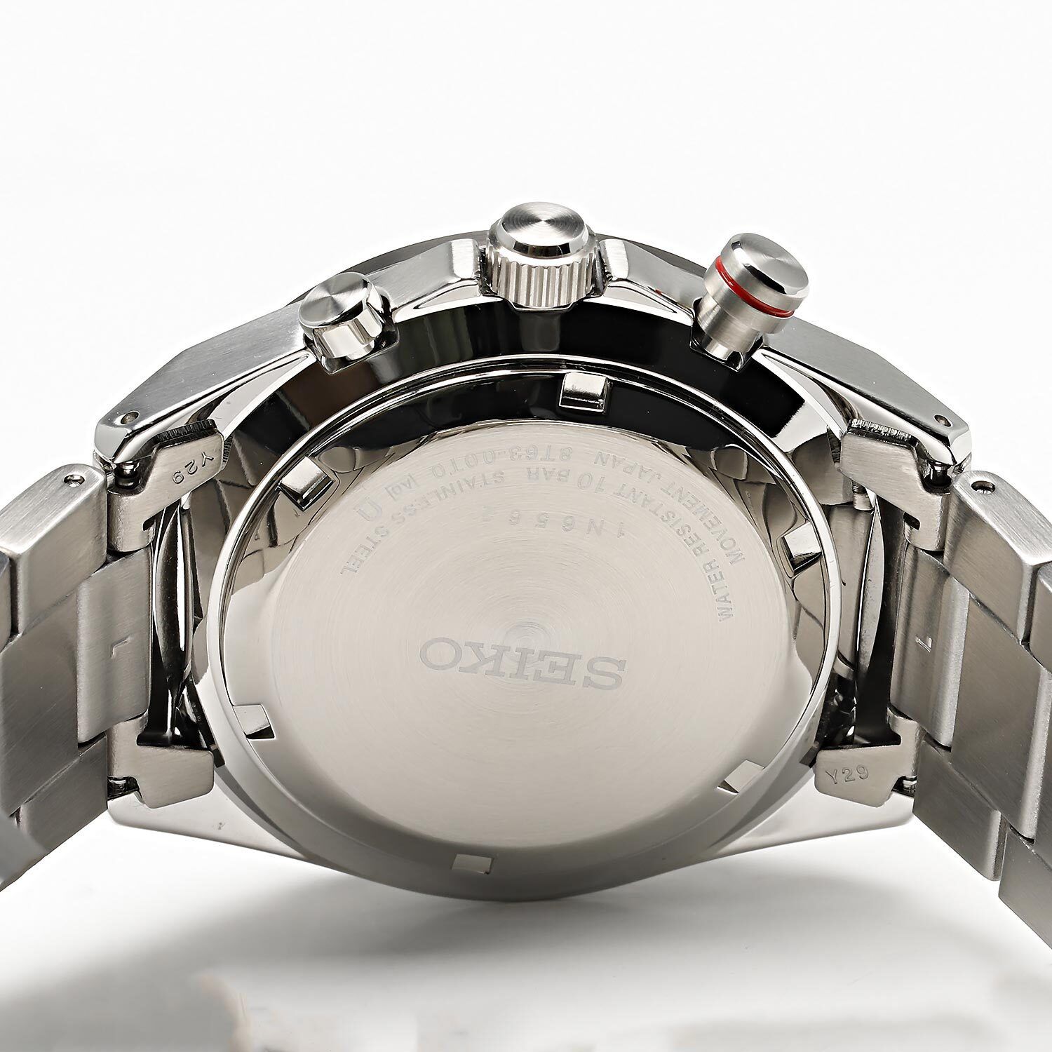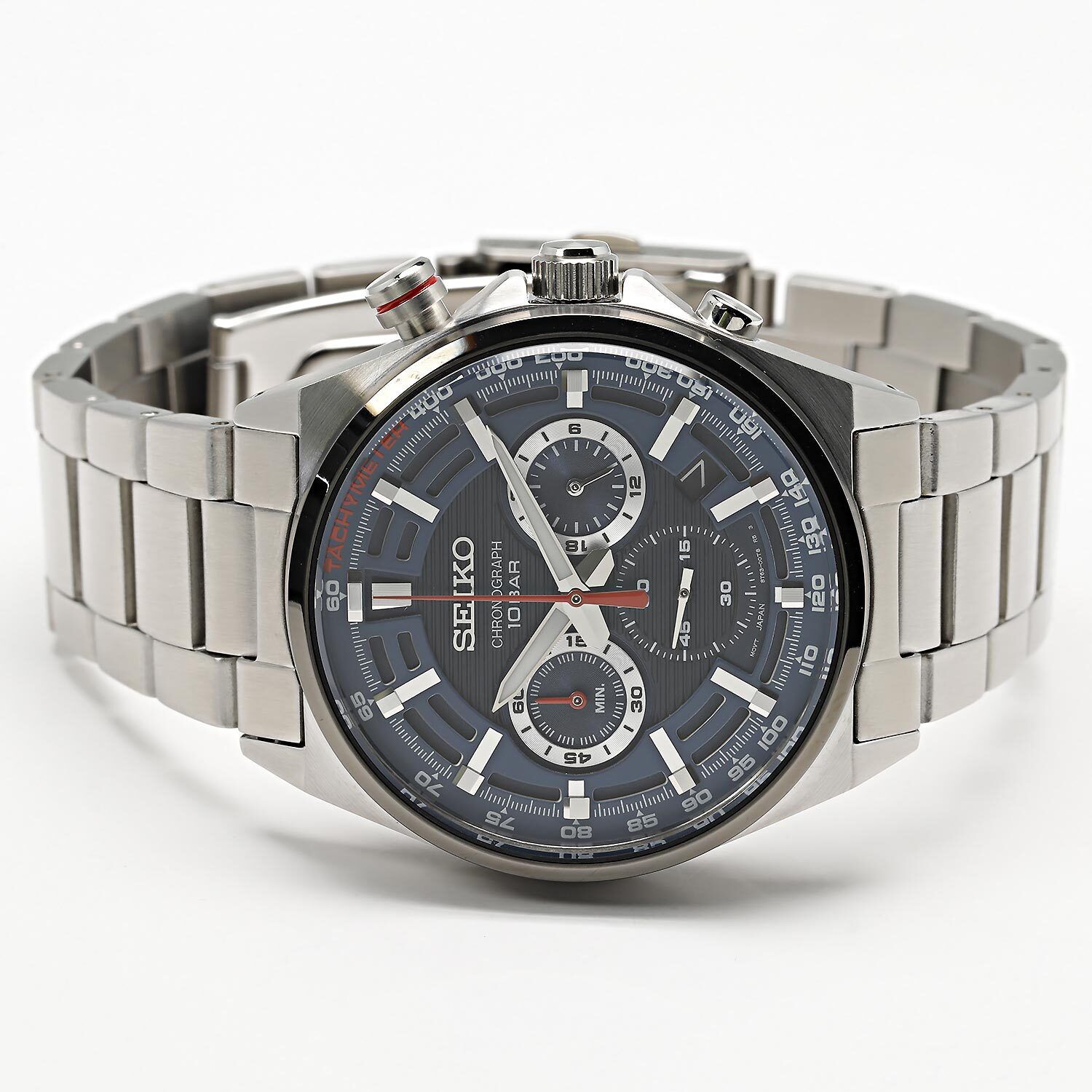 Мужские кварцевые аналоговые наручные часы-хронограф с секундомером и тахиметрической шкалой. Коллекция Discover More. Калибр механизма 8T63. Центральные часовая и минутная стрелки, секундная стрелка вынесена на отдельный малый циферблат в позиции 6 ч. Апертура даты между 4 и 5 часами. Стрелочный указатель времени суток с 24-х часовой шкалой вынесен на дополнительный малый циферблат в позиции 3 ч. Секундомер до 1ч, точность 1/5с. Синий двухуровневый циферблат с часовыми метками в виде штрихов. Стрелки и метки с люминесцентным покрытием LumiBrite, которое светится в темноте после непродолжительного воздействия света. Корпус из нержавеющей стали. Диаметр корпуса 41 мм, толщина 12,3 мм. Переводная головка с защитой. Тахиметрическая шкала на циферблате (для расчета скорости на основании времени в пути). Завинчивающаяся задняя крышка. Стекло Хардлекс (Hardlex) - закаленное минеральное стекло, разработанное компанией Seiko Watch Corporation, обладающее высокой устойчивостью к мелким механическим повреждениям и царапинам. Стальной браслет с раскладывающейся застежкой. Ширина браслета 22мм. Водонепроницаемость WR100 (часы подходят для плавания с маской, трубкой и обычного плавания). Вес примерно 152 г.