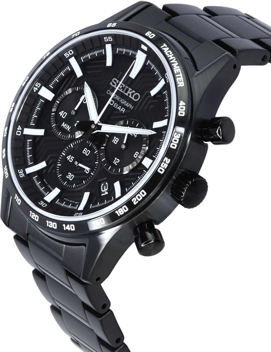 Мужские кварцевые аналоговые наручные часы-хронограф с секундомером и тахиметрической шкалой. Коллекция Discover More. Калибр механизма 8T63. Центральные часовая и минутная стрелки, секундная стрелка вынесена на отдельный малый циферблат в позиции 6 ч. Апертура даты между 4 и 5 часами. Стрелочный указатель времени суток с 24-х часовой шкалой вынесен на дополнительный малый циферблат в позиции 3 ч. Секундомер до 1ч, точность 1/5с. Чёрный циферблат с часовыми метками в виде штрихов. Стрелки и метки с люминесцентным покрытием LumiBrite, которое светится в темноте после непродолжительного воздействия света. Корпус из нержавеющей стали с PVD покрытием чёрного цвета. Тахиметрическая шкала на безеле (для расчета скорости на основании времени в пути). Диаметр корпуса 43 мм, толщина 11,6 мм. Рифлёная переводная головка. Завинчивающаяся задняя крышка. Устойчивое к возникновению мелких царапин сапфировое стекло. Стальной браслет с PVD покрытием чёрного цвета, раскладывающаяся застежка. Ширина браслета 22мм. Водонепроницаемость WR100 (часы подходят для плавания с маской, трубкой и обычного плавания). Вес около 158 г.