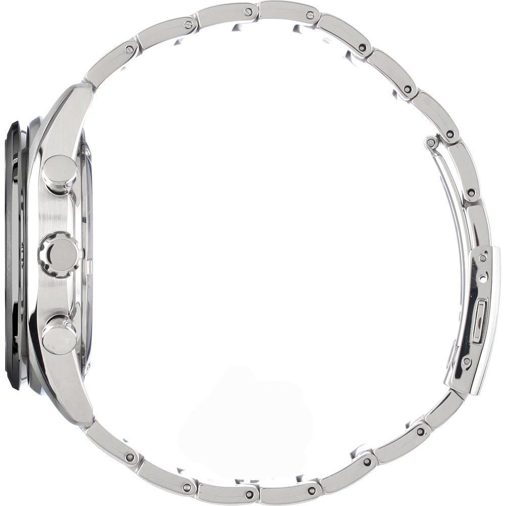 Мужские кварцевые аналоговые наручные часы-хронограф с секундомером на солнечной батарее. Коллекция Conceptual Series Sports. Калибр механизма V176. Питание от солнечной энергии. Срок работы аккумулятора с полным зарядом около 6-ти месяцев. Примерный срок службы аккумулятора 10 лет. Функция индикации заряда (EOL -End of Life – при ослабевании заряда элемента питания секундная стрелка двигается через 2 деления) и функция предотвращения перезарядки. Секундомер с точностью 1/20с и временем измерения 1ч. Центральные часовая и минутная стрелки, секундная стрелка вынесена на дополнительный малый циферблат в положении 9 ч. Функция остановки секундной стрелки (stop-second) для возможности более точной установки времени. Чёрный циферблат с часовыми метками в виде штрихов. Стрелки и метки покрыты люминесцентным напылением LumiBright, которое светится в темноте после непродолжительного воздействия света. Апертура даты в положении 3 ч. Тахиметрическая шкала на циферблате (для расчета скорости на основании времени в пути). Устойчивое к возникновению мелких царапин сапфировое стекло. Круглый стальной корпус с покрытием серого цвета на безеле. Диаметр корпуса 41,4 мм, толщина 12,1 мм. Завинчивающаяся задняя крышка. Стальной браслет с раскладывающейся застежкой. Водонепроницаемость WR100 (часы подходят для плавания с маской, трубкой и обычного плавания). Вес около 131 г.