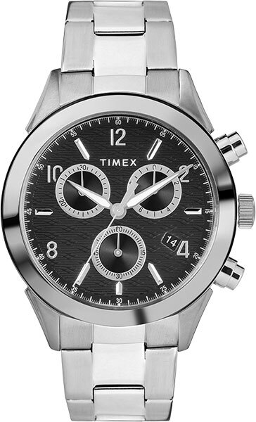 Кварцевый хронограф. Водостойкость WR 50. Часы, минуты, секунды. Индикация даты. Хронограф. Черный циферблат с часовыми индексами в виде штрихов и цифр. Корпус выполнен из нержавеющей стали. Диаметр корпуса 40 мм, толщина 11 мм. Устойчивое к мелким механическим повреждениям минеральное стекло. Браслет выполнен из нержавеющей стали. Раскладывающаяся застежка.