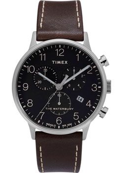 Кварцевый хронограф. Водостойкость WR 30. Часы, минуты, секунды. Индикация даты. Хронограф. Черный циферблат с часовыми индексами в виде штрихов и цифр. Подсветка Indiglo. Корпус выполнен из нержавеющей стали. Диаметр корпуса 40 мм, толщина 11 мм. Устойчивое к мелким механическим повреждениям минеральное стекло. Кожаный ремешок коричневого цвета. Стальная застежка.