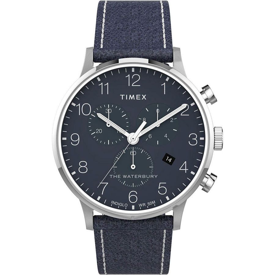 Мужской кварцевый хронограф. Центральные часовая и минутная стрелки, секундная стрелка вынесена на отдельный циферблат. Апертура даты в позиции 4 часов. Секундомер. Серебристый циферблат. Арабская индикация времени. Круглый корпус выполнен из полированной нержавеющей стали. Диаметр корпуса составляет 40 мм. Коричневый кожаный ремешок шириной 20 мм, стандартная застежка. Прочное минеральное стекло устойчивое к мелким механическим повреждениям. Водостойкость WR 50 (мытье рук, дождь).