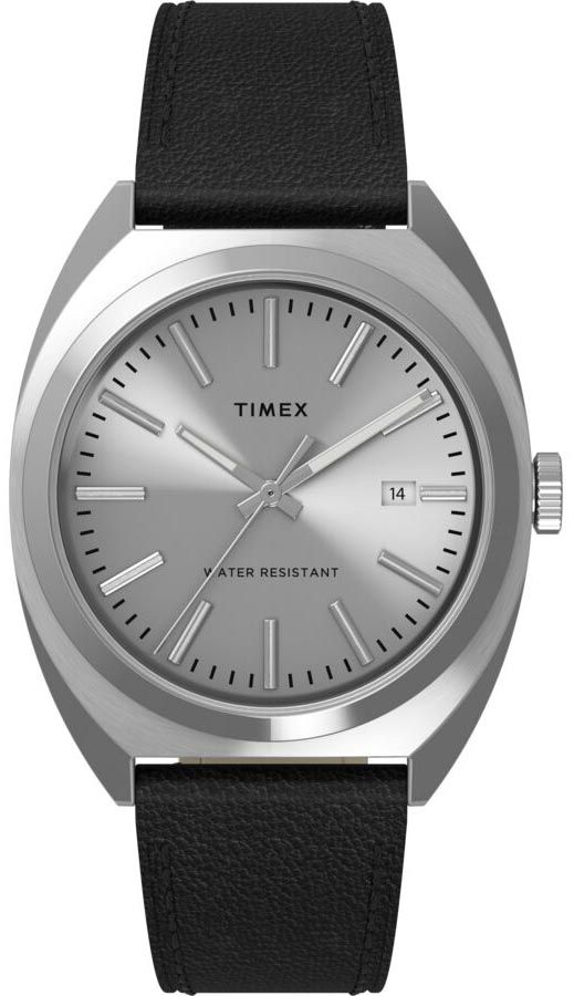 Мужские кварцевые часы. Центральные часовая, минутная и секундная стрелки. Апертура даты в позиции 3 часов. Серебристый циферблат. Корпус выполнен из полированной нержавеющей стали. Диаметр корпуса составляет 38 мм. Черный кожаный ремешок шириной 20 мм, стандартная застежка. Прочное минеральное стекло устойчивое к мелким механическим повреждениям. Водостойкость WR 50 (мытье рук, дождь).