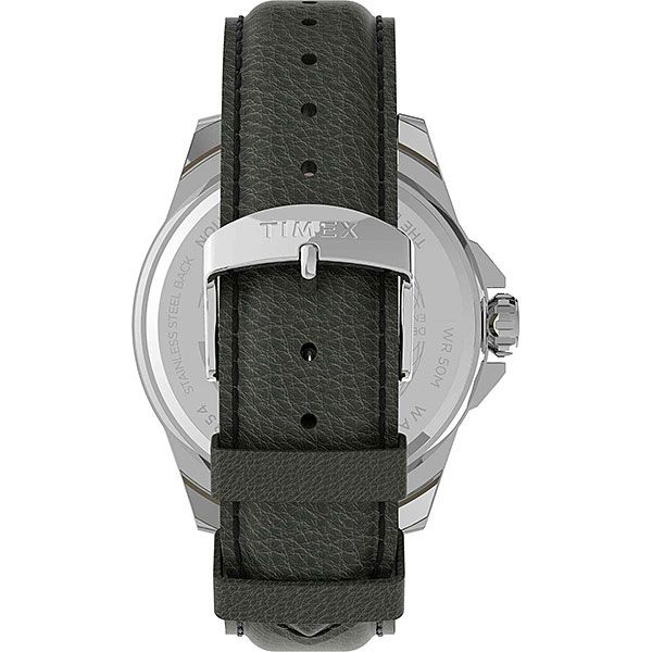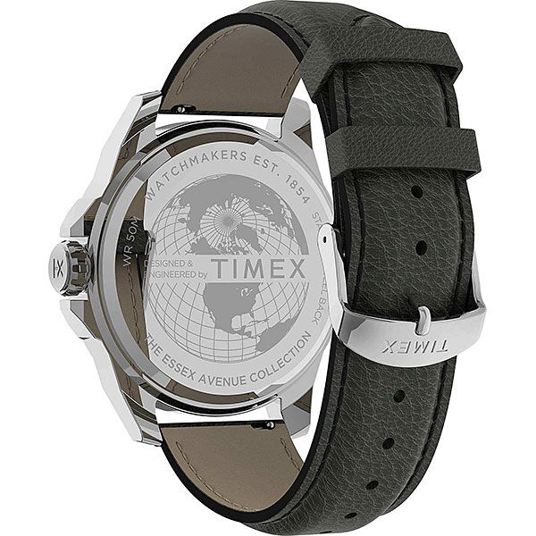 Мужские кварцевые аналоговые часы. Коллекция Essex Avenue. Центральные часовая, минутная и секундная стрелки. Индикация даты и дня недели на позиции трех часов. Стрелки и метки с люминесцентным покрытием. Зелёный циферблат с часовыми индексами в виде штрихов и и арабской цифры 12. Круглый корпус диаметром 44 мм. Устойчивое к возникновению мелких механических повреждений минеральное стекло. Рифленая переводная головка с защитой. Кожаный ремешок зелёного цвета шириной 22 мм с классической застежкой. Водостойкость WR 50 (мытьё рук, дождь).