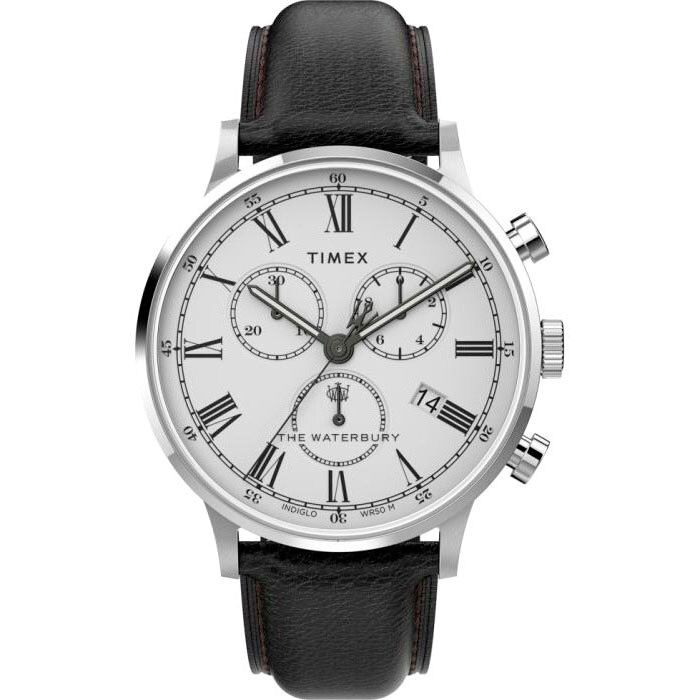 Кварцевый хронограф. Водостойкость WR 50. Часы, минуты, секунды. Индикация даты. Подсветка Indiglo. Белый циферблат с часовыми индексами в виде цифр. Металлический корпус. Диаметр корпуса 40 мм. Устойчивое к возникновению мелких механических повреждений минеральное стекло. Кожаный ремешок черного цвета.