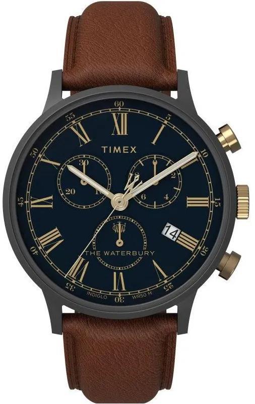 Мужские кварцевые часы с из серии Waterbury Traditional. Стальной круглый корпус. Синий циферблат с окошками даты и дня недели. Минеральное стекло. Водозащита 100 м. Коричневый кожаный ремешок с классической пряжкой и системой быстрой замены.