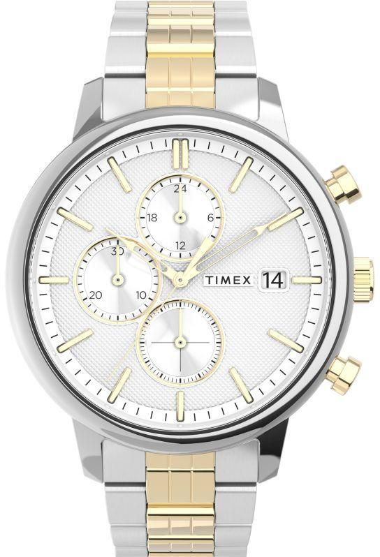 Мужской кварцевый хронограф. Центральные часовая и минутная стрелки, секундная стрелка вынесена на малый циферблат. Апертура даты в позиции 3 часов. 12/24х часовой формат времени. Секундомер. Серебристый циферблат. Круглый корпус выполнен из нержавеющей стали. Диаметр корпуса составляет 45 мм, толщина 11 мм. Стальной браслет с частичным покрытием шириной 20 мм, раскладывающаяся застежка. Прочное минеральное стекло устойчивое к мелким механическим повреждениям. Водостойкость WR 50 (мытье рук, дождь).