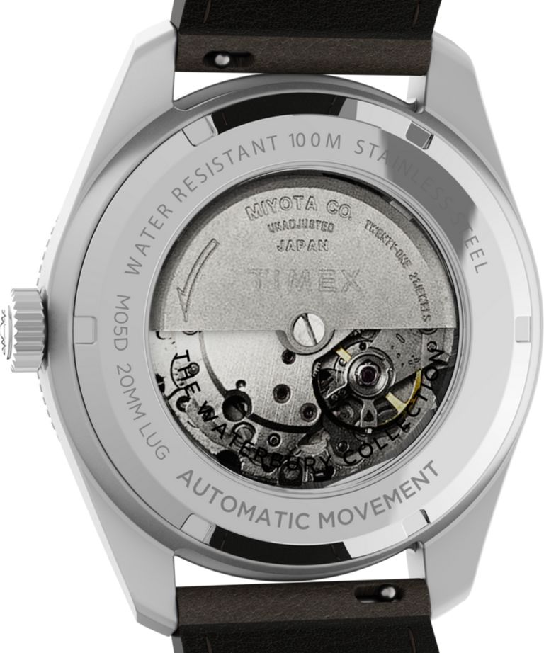 Мужские аналоговые механические наручные часы с автоподзаводом. Коллекция Waterbury Dive Automatic. В механизме 21 камень. Центральные часовая минутная и секундная стрелки. Часовые метки в виде штрихов. Метки и стрелки с люминесцентным покрытием, которое светится в темноте после непродолжительной зарядки на свету. Зелёный циферблат. Индикация даты и дня недели в позиции 3 ч. Круглый корпус из нержавеющей стали диаметром 40 мм, толщиной 13 мм. Вращающийся безель, Рифленая переводная головка. Прозрачная завинчивающаяся задняя крышка. Коричневый кожаный ремешок шириной 20 мм, классическая застежка. Водозащита 100WR (плавание без погружения).