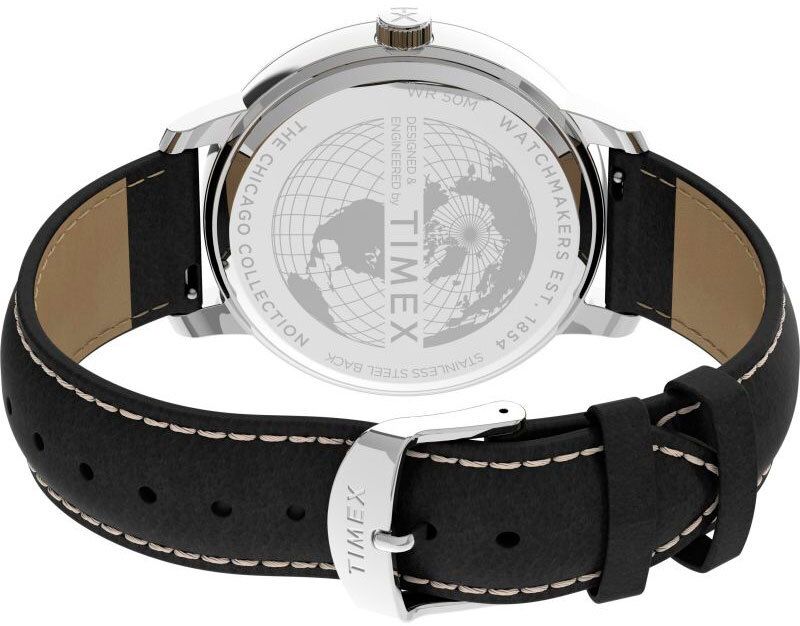 Мужские аналоговые кварцевые часы. Коллекция Chicago. Центральные часовая, минутная и секундная стрелки. Апертура даты и дня недели в позиции 3 часов. Чёрный циферблат. Часовые метки в виде арабских цифр и штрихов. Круглый корпус диаметром 45 мм. Чёрный кожаный ремешок шириной 20 мм, стандартная застежка. Прочное минеральное стекло устойчивое к мелким механическим повреждениям. Водостойкость WR 50 (мытье рук, дождь).