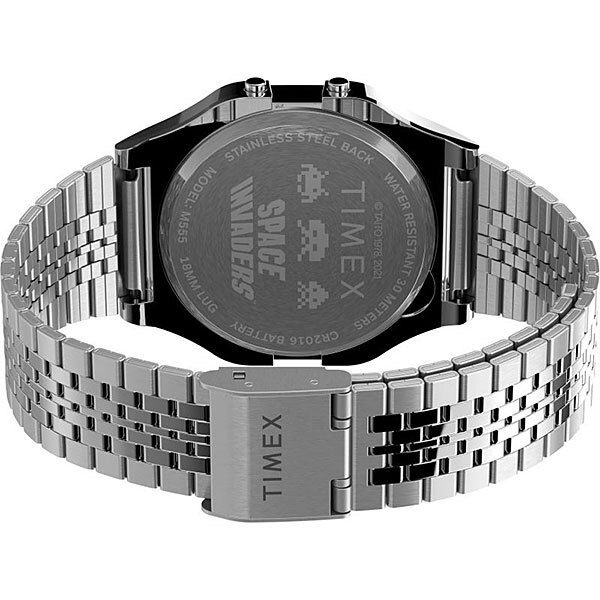 Мужские электронные кварцевые часы-хронограф с секундомером. Коллекция T80 Space Invaders. Специальная серия с пиксельной графикой изображающей пришельцев и лазерные шутеры. Точность хронографа 1/100с. Функция ежедневного будильника. Отображение числа, дня недели и месяца. Сегментный циферблат с фирменной подсветкой Indiglo. Прямоугольный корпус из полимерного пластика серебристого цвета. Размер корпуса 34 х 29 мм, толщина 10 мм. Задняя крышка украшена гравировкой. Стальной браслет шириной 18 мм, раскладная застежка. Пластиковое стекло. Водостойкость WR 30 (брызги).