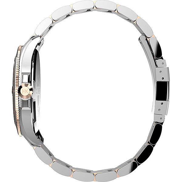 Мужские кварцевые аналоговые наручные часы. Коллекция Harborside Coast. Центральные часовая, минутная и секундная стрелки. Чёрный циферблат с метками в виде штрихов и точек, 12-ти часовая метка в виде треугольника. Метки и стрелки с люминесцентным покрытием, которое светится в темноте после непродолжительной зарядки на свету. Окошко даты с увеличительным стеклом находится в положении 3 ч. Круглый корпус выполнен из латуни с частичным PVD покрытием. Диаметр корпуса 43 мм. Рифленый вращающийся безель с минутной шкалой. Устойчивое к мелким механическим повреждениям минеральное стекло. Минеральное стекло устойчивое к мелким механическим повреждениям. Рифленая переводная головка с защитой. Стальная задняя крышка с гравировкой. Стальной браслет с частичным PVD покрытием цвета розового золота, раскладывающаяся застежка. Водостойкость WR 100 (плавание).