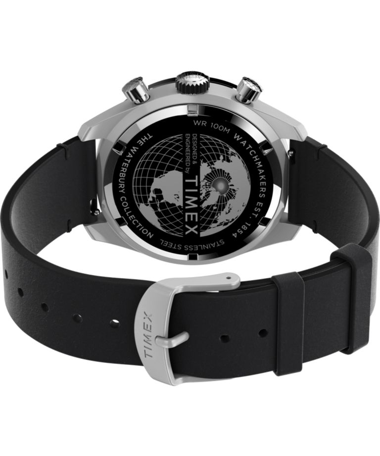 Мужские кварцевые аналоговые наручные часы-хронограф с секундомером и тахиметрической шкалой. Коллекция Waterbury Chronograph. Коллекция посвящена городу Waterbury, где в 1854 году была основана компания Timex. Центральные часовая и минутная стрелки. Секундная стрелка вынесена на дополнительный малый циферблат в положении 9 ч. Апертура даты в позиции иежду 4 и 5 ч. Чёрный циферблат с часовыми индексами в виде штрихов. На стрелки и метки нанесено люминесцентное покрытие, которое светится в темноте после непродолжительного нахождения на свету. Секундомер. Круглый корпус из нержавеющей стали. Диаметр корпуса 41 мм, толщина 13 мм. Рифленая переводная головка. Минеральное стекло устойчивое к мелким механическим повреждениям. Чёрный кожаный ремешок шириной 20 мм, стандартная застежка. Стальная задняя крышка. Водостойкость WR 100 (плавание и ныряние без акваланга).