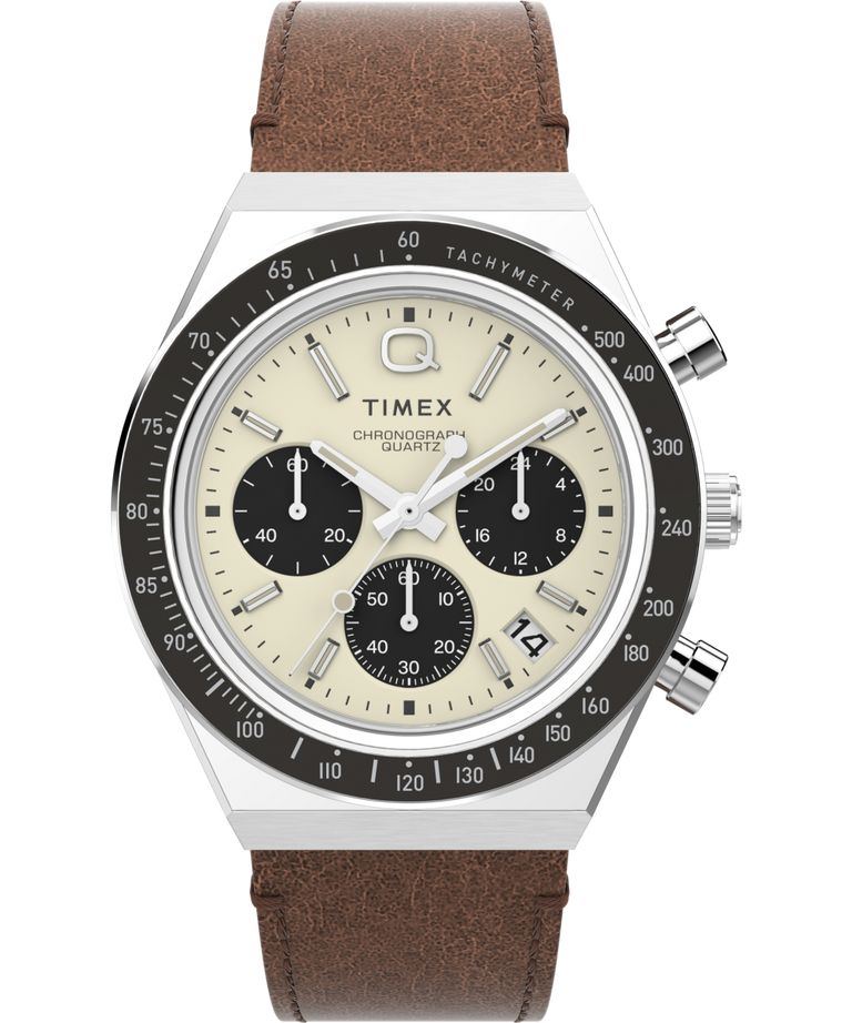 Мужские кварцевые аналоговые наручные часы-хронограф с секундомером и тахиметрической шкалой. Коллекция Q Chronograph. Апертура даты в позиции между 4 и 5 ч. Бежевый циферблат с часовыми индексами в виде штрихов. На стрелки и метки нанесено люминесцентное покрытие, которое светится в темноте после непродолжительного нахождения на свету. Секундомер. Круглый корпус из нержавеющей стали. Диаметр корпуса 40 мм, толщина 13,5 мм. Рифленая переводная головка. Минеральное стекло устойчивое к мелким механическим повреждениям. Коричневый кожаный ремешок шириной 18 мм, стандартная застежка. Стальная задняя крышка с дополнительной крышкой батарейного отсека.. Водостойкость WR 50 (мытьё рук, дождь).