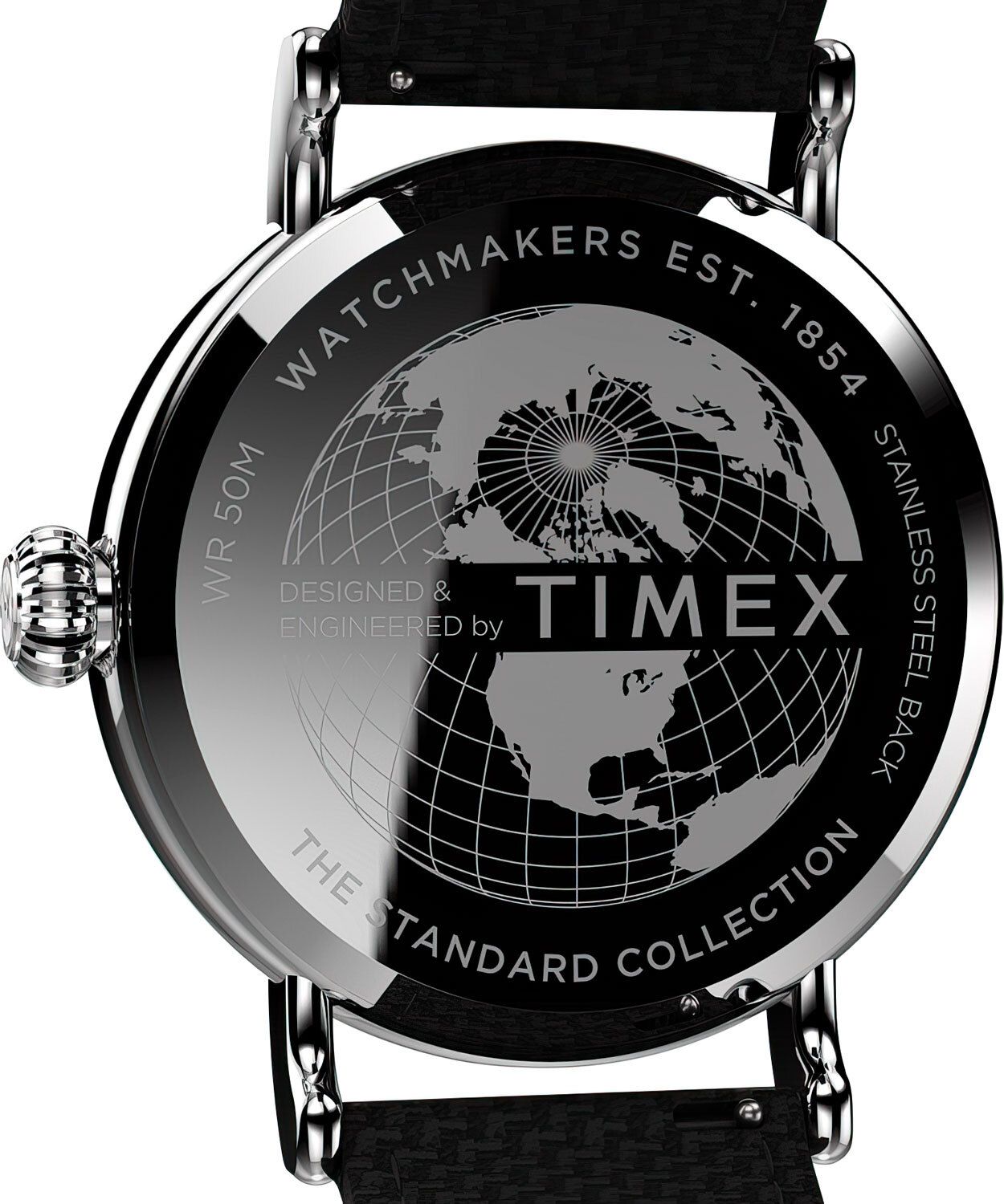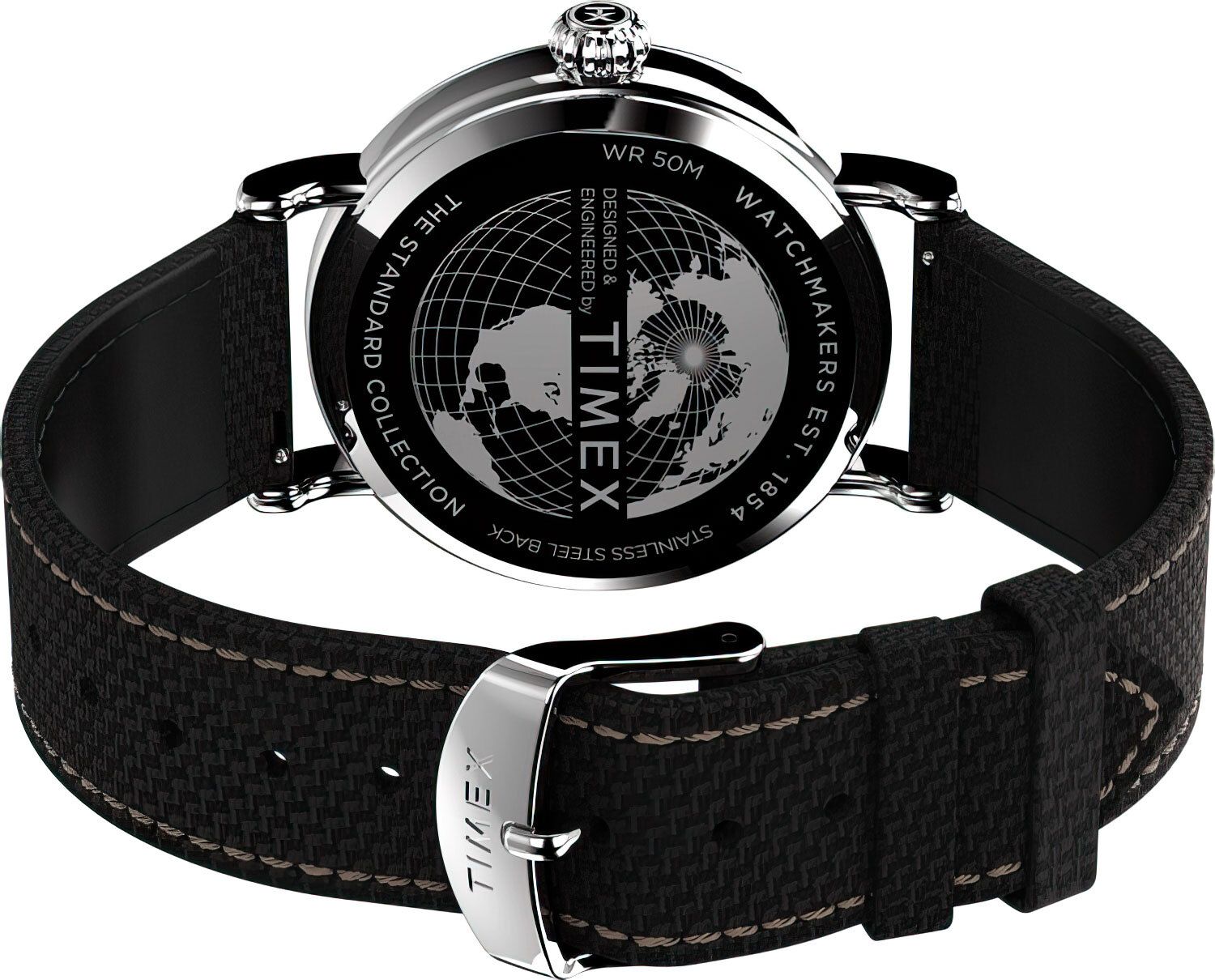 Мужские кварцевые аналоговые часы. Коллекция Standard. Центральные часовая, минутная и секундная стрелки. Чёрный циферблат с часовыми метками в виде штрихов и арабских цифр. Стрелки с люминесцентным покрытием, которое светится в темноте после непродолжительной зарядки на свету. Круглый корпус диаметром 40 мм, толщиной 9,5 мм. Фирменная подсветка циферблата Indiglo (Indiglo - запатентованная технология компании Timex, представляющая собой электролюминесцентную панель нежно-зеленого или голубого цвета, с помощью которой подсвечивается весь циферблат). Черный текстильный ремешок на кожаной основе. Ширина ремешка 20 мм, стандартная застежка. Прочное минеральное стекло устойчивое к мелким механическим повреждениям. Водостойкость WR 50 (мытье рук, дождь).