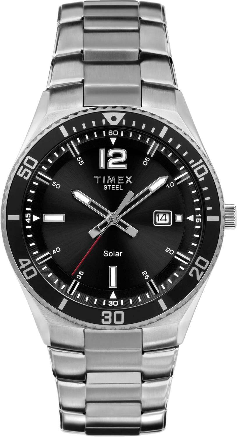 Мужские аналоговые кварцевые наручные часы на солнечной батарее. Центральные часовая, минутная и секундная стрелки. Чёрный циферблат с часовыми индексами в виде штрихов и арабской цифры 12 Стрелки и метки с люминесцентным покрытием, которое светится в темноте после непродолжительной зарядки на свету. Окошко даты находится в положении 3 часа. Устойчивое к мелким механическим повреждениям минеральное стекло. Круглый корпус выполнен из нержавеющей стали. Диаметр корпуса 43 мм. Рифленая переводная головка. Браслет из нержавеющей стали с раскладывающейся застежкой. Ширина браслета 27 мм. Водозащита 50 WR (мытьё рук, дождь).