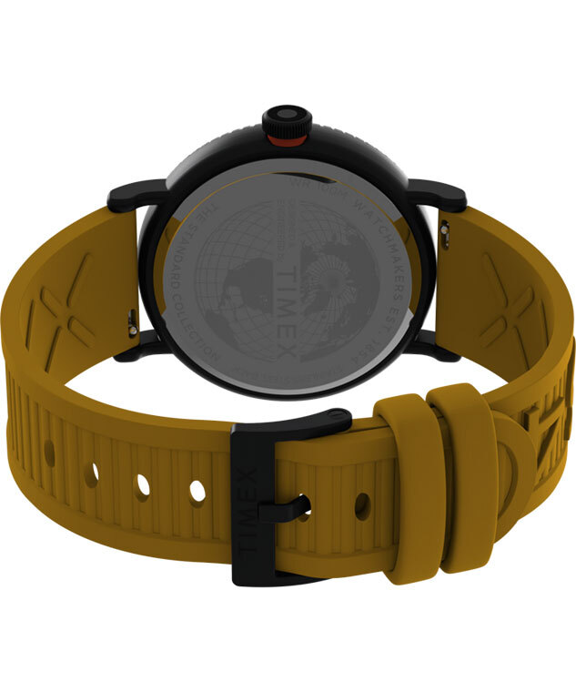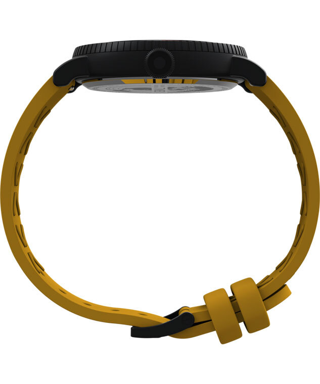 Мужские кварцевые аналоговые наручные часы. Коллекция Timex Standard Diver . Центральные часовая, минутная и секундная стрелки. Чёрный циферблат с часовыми метками в виде штрихов и арабских цифр. Люминесцентные стрелки и индексы (светятся в темноте после нахождения на свету). Круглый корпус з латуни с покрытием чёрного цвета. Диаметр корпуса 43мм, толщина 11 мм. Вращающийся безель, Устойчивое к мелким механическим повреждениям минеральное стекло. Пластиковый ремешок жёлтого цвета шириной 22 мм, классическая застёжка. Водозащищенность 100 WR (плавание и ныряние без акваланга).