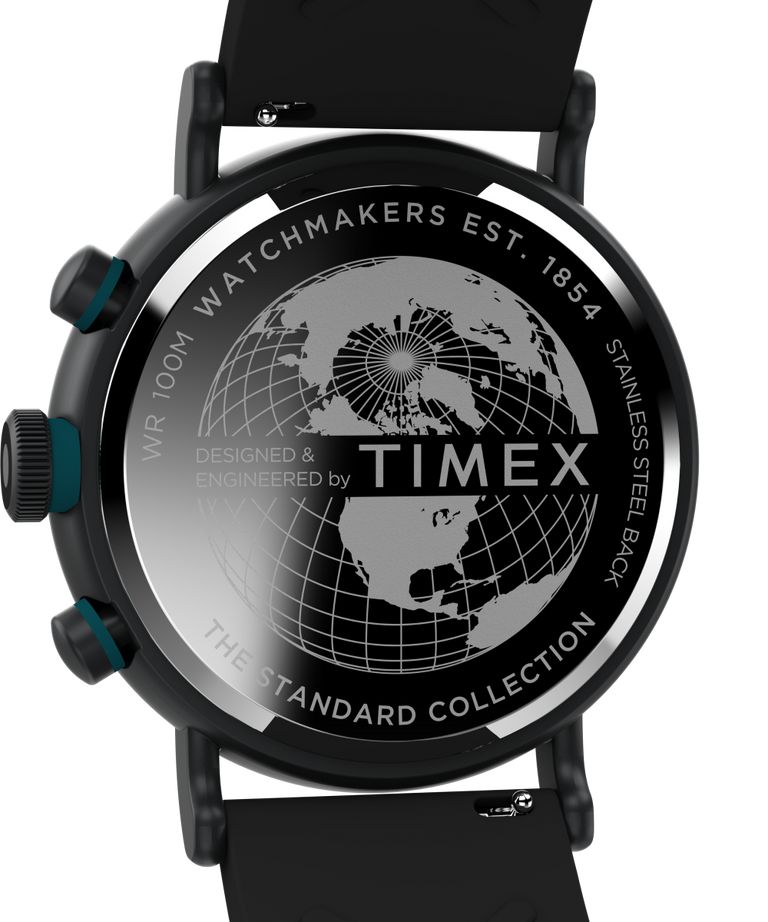 Мужские кварцевые аналоговые наручные часы-хронограф с секундомером и тахиметрической шкалой. Коллекция Standard Tachymeter Chronograph. Центральные часовая и минутная стрелки. Секундная стрелка вынесена на дополнительный малый циферблат в положении 9 ч. Апертура даты в позиции между 4 и 5 ч. Отображение времени в 24-часовом формате на отдельном малом циферблате в положении 3 часов. Чёрный циферблат с часовыми индексами в виде штрихов и арабской цифры 12. На стрелки и метки нанесено люминесцентное покрытие, которое светится в темноте после непродолжительного нахождения на свету. Секундомер. Круглый корпус диаметром 43 мм, толщиной 12 мм. Минеральное стекло устойчивое к мелким механическим повреждениям. Чёрный пластиковый ремешок шириной 22 мм, стандартная застежка. Стальная задняя крышка. Водостойкость WR 100 (плавание и ныряние без акваланга).