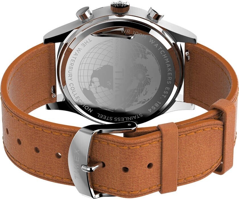 Мужские кварцевые аналоговые наручные часы-хронограф с секундомером. Коллекция Waterbury Traditional Chronograph. Центральные часовая и минутная стрелки, секундная стрелка вынесена на отдельный малый циферблат в позиции 6 ч. Серый циферблат с метками в виде арабских цифр. Стрелки и метки с люминесцентным покрытием, которое светится в темноте после непродолжительной зарядки на свету. Окошко даты в позиции 4 ч. Круглый стальной корпус диаметром 42 мм, толщиной 11,5 мм. Рифленая переводная головка. Стальная задняя крышка. Кожаный коричневый ремешок с классической застёжкой. Водозащита 100WR (плавание с маской и трубкой).