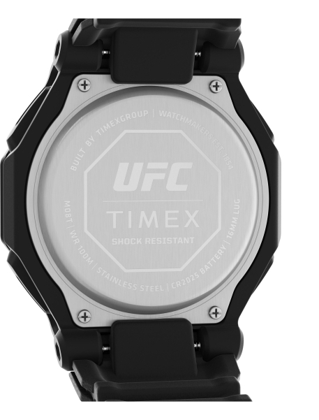 Мужские кварцевые аналогово-цифровые наручные часы-хронограф с секундомером. Коллекция UFC Colossus Fight Week. Мультифункциональная комбинированная модель с будильником, хронографом, таймером. Подсветка Indiglo. Центральные часовая и минутная стрелки. Стрелочный указатель дня недели. Часовые метки в виде штрихов. Стрелки и метки с люминесцентным покрытием (светятся в темноте после нахождения на свету). Восьмиугольный корпус из ударопрочного полимерного пластика чёрного цвета. Устойчивое к мелким механическим повреждениям минеральное стекло. Чёрный пластиковый ремешок шириной 22 мм, классическая застёжка. Водонепроницаемость 100 WR (плавание и погружение без акваланга).