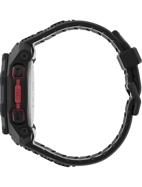Мужские кварцевые электронные наручные часы-хронограф с секундомером. Коллекция UFC Knockout. Мультифункциональная электронная модель с будильником, хронографом, таймером обратного отсчёта, таймером интервальных тренировок, подсветкой дисплея Indiglo. Корпус из ударопрочного полимерного пластика чёрного цвета (сертифицированны по стандарту ISO 1413). Диаметр корпуса 48мм, толщина 16 мм. Стальной безель с покрытием чёрного цвета. Пластиковое стекло. Чёрный пластиковый ремешок шириной 26 мм. Водонепроницаемость 100 WR (плавание и погружение без акваланга). Чтобы сохранить водонепроницаемость нельзя нажимать кнопки под водой.