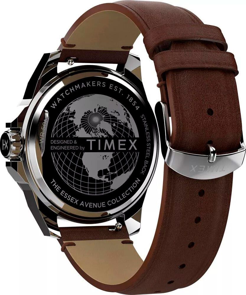Мужские кварцевые аналоговые наручные часы. Коллекция Essex Avenue. Центральные часовая, минутная и секундная стрелки. Зелёный циферблат с часовыми индексами в виде штрихов и арабской цифры 12. Стрелки и метки с люминесцентным покрытием, которое светится в темноте после непродолжительного воздействия света. Окошко даты и дня недели в позиции 3 ч. Корпус из латуни с покрытием серебристого цвета. Диаметр корпуса 46 мм, толщина 10 мм. Восьмиугольный безель. Рифленая переводная головка c защитой. Коричневый кожаный ремешок с классической застежкой buckle. Ширина ремешка 22 мм. Минеральное стекло устойчивое к мелким механическим повреждениям. Водостойкость WR 50 (мытьё рук, дождь).